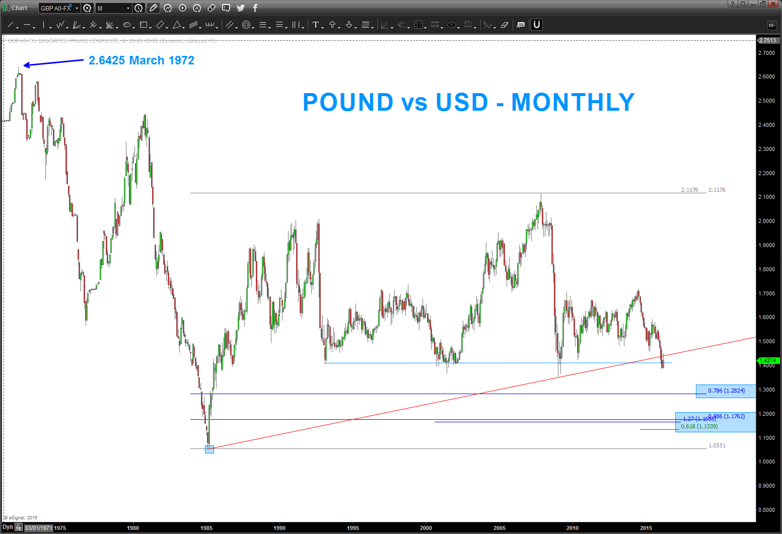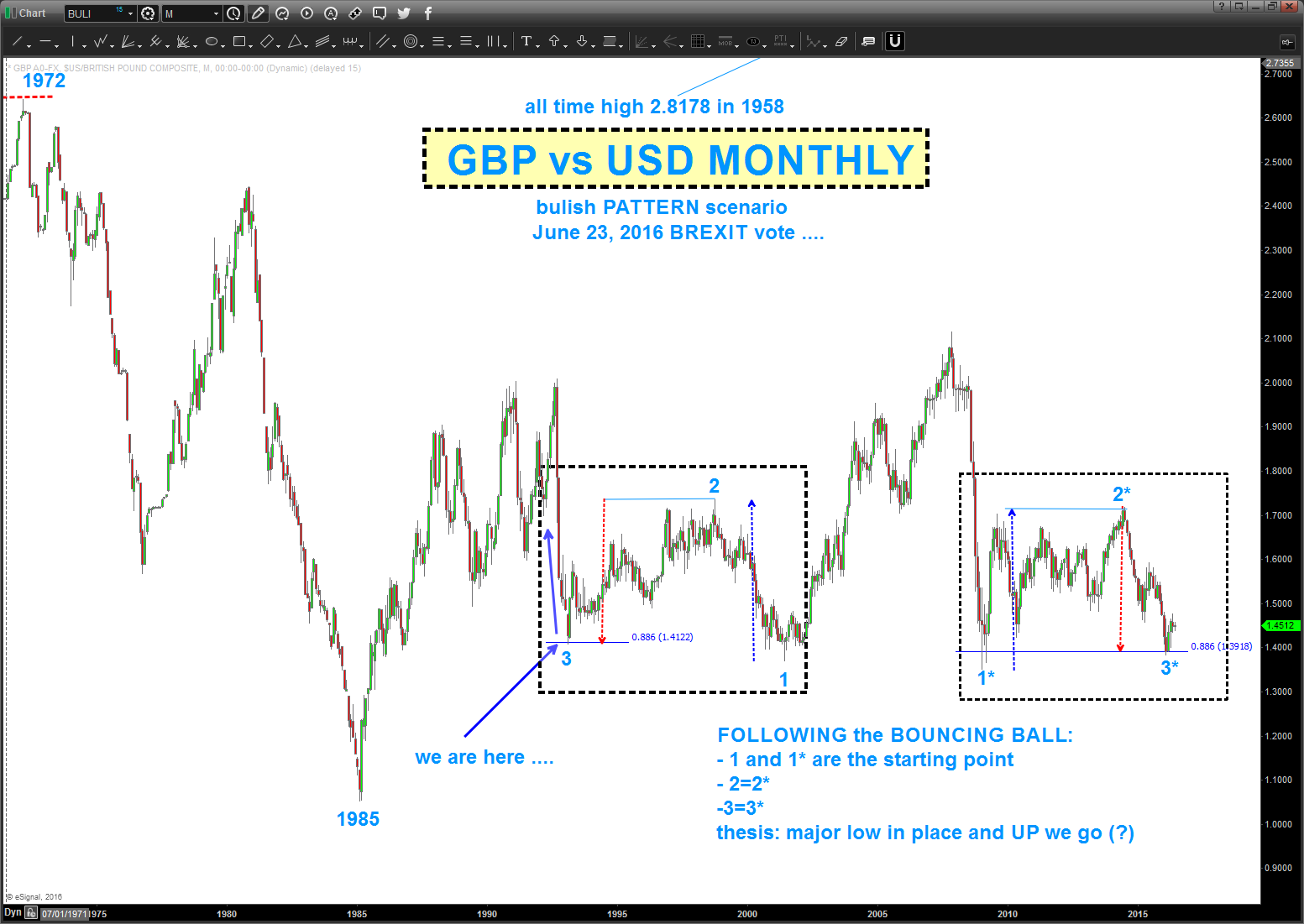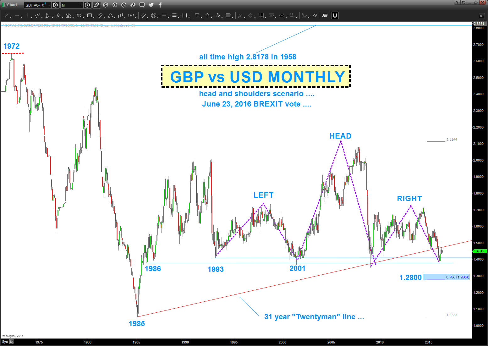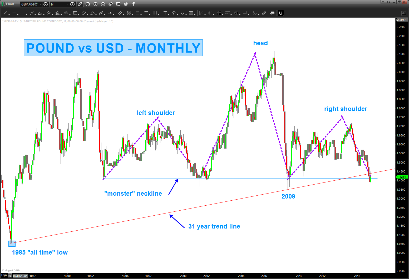Head and Shoulders Scenario (first chart): as for me, IF (I have no idea if it’s going to happen OR not) the trend line breaks then how about a shorting a retest of 23 year long neckline? wish I could provide more “exact” detail .. I can’t. What we can do is see that the Pound vs USD has not closed below the neck line in 30 years.