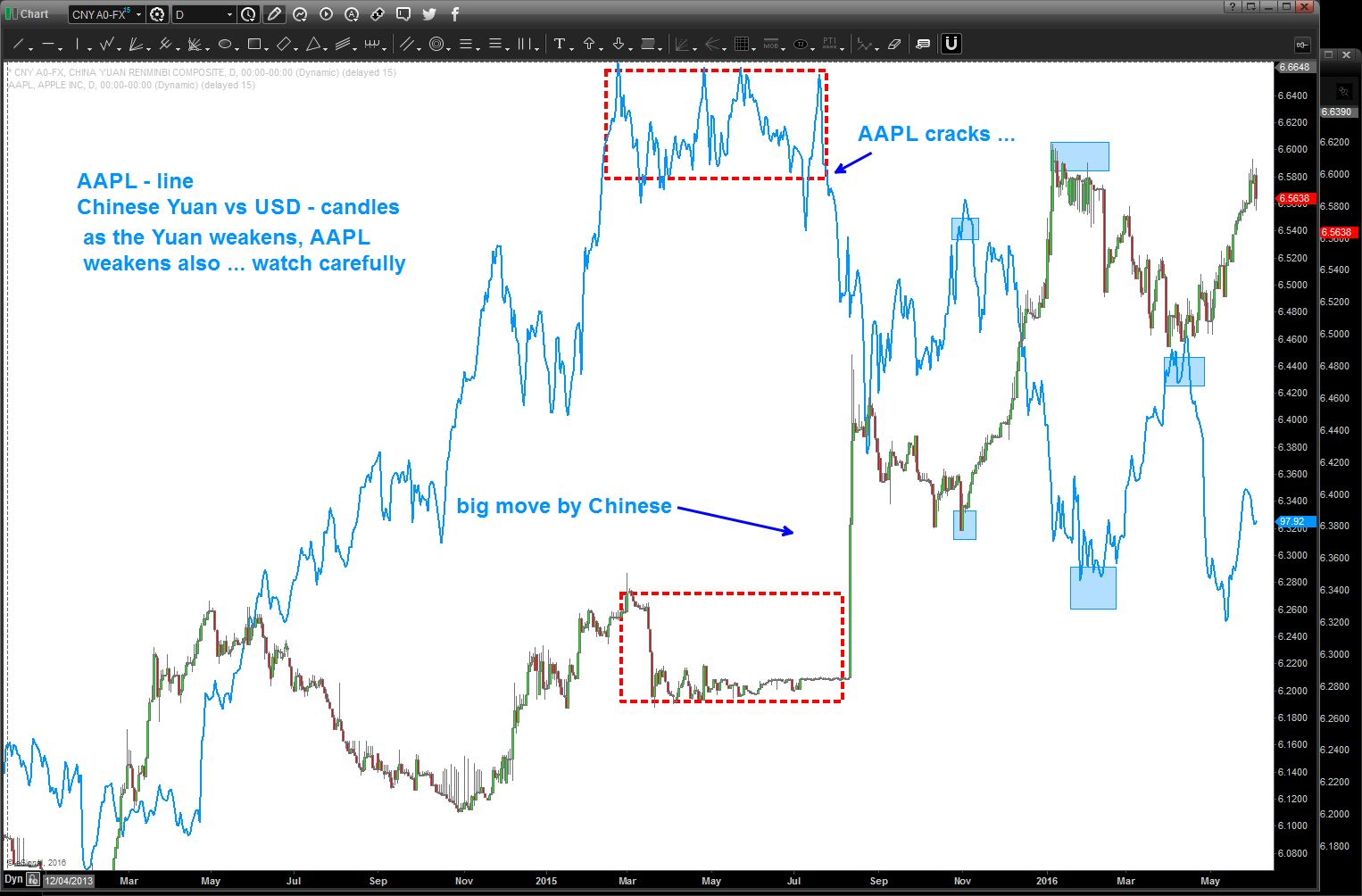 it’s take a little bit of time – imagine that – but as the entire world was wondering ….”hmmm, I wonder if the Chinese are done letting the Yuan gain strength against the USD” $AAPL was making it’s all time high and digesting this same thought .. (see dashed red rectangle below). The Chinese answered the question w/ a BIG EXPLOSIVE CANDLE … Answer: guess this move weakening the Yuan is real.