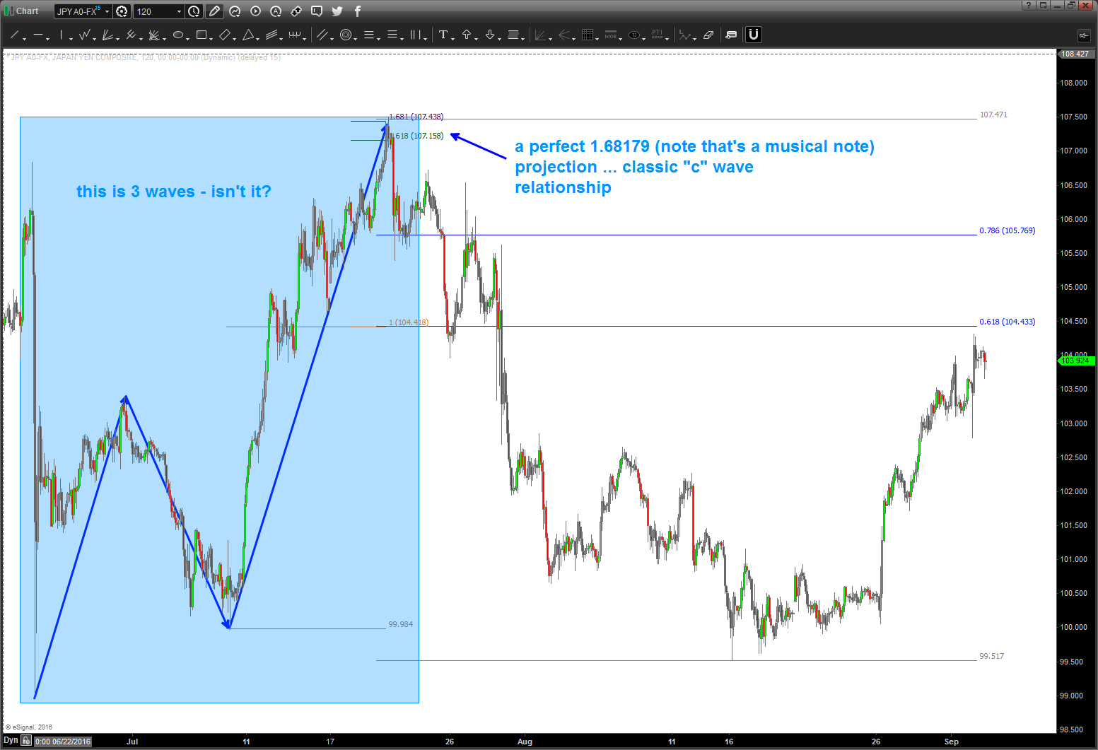 Here’s what I DO NOT like ... I DO NOT LIKE that the rally UP has been a clear three waves …so, crap that says one more low on the USD vs JPY. SO I WAIT … WHAT AM I MISSING HERE? 🙂