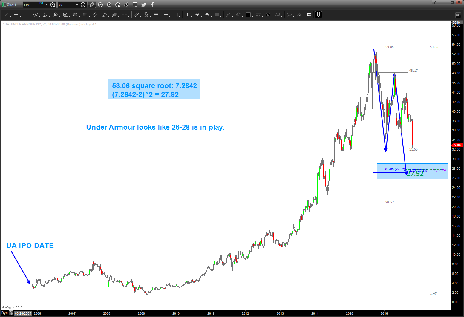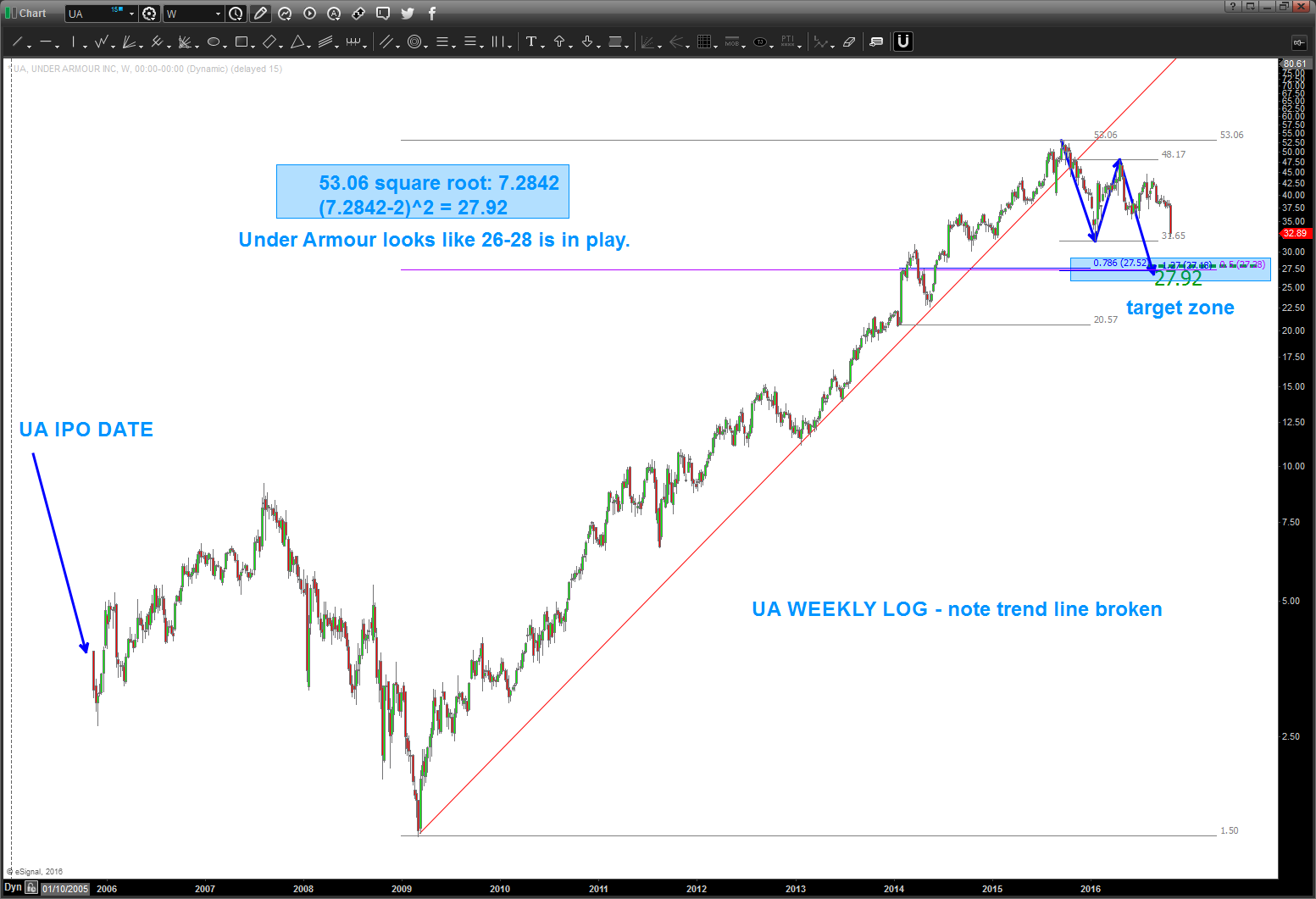 10/25/2016 – I was asked to take a look at Under Armour back in June. I saw this pattern – again – had ZERO idea if it would get down there. As a pattern recognition dude, that’s the pattern .. .as of today, appears it’s going to make that level. Some thoughts …