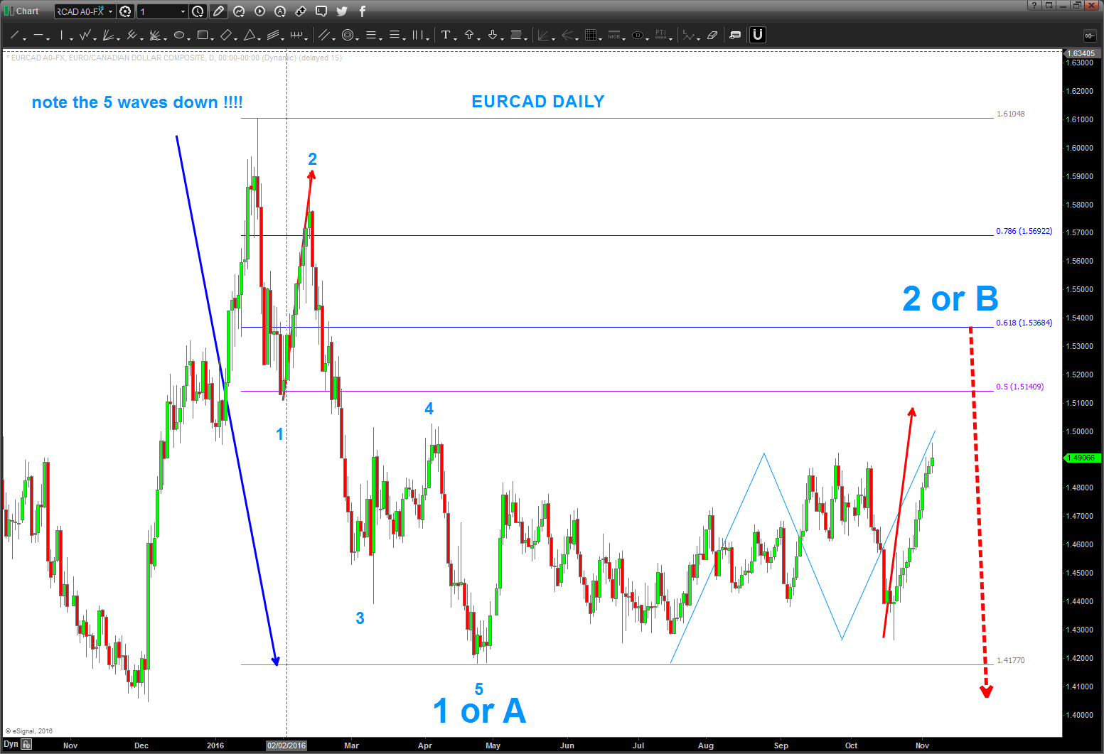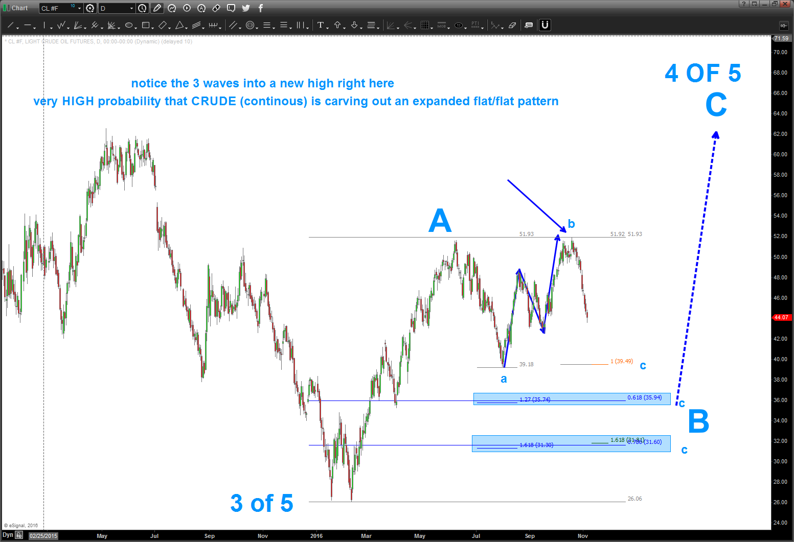 11/5/2016 – Crude Continuous is giving us a nice “heads up” that this move is CORRECTIVE in the scheme of a much larger corrective pattern to finish a big big 4. the market corrects (most of the time) in 3 waves labeled A-B-C …in this case let’s follow the set up: