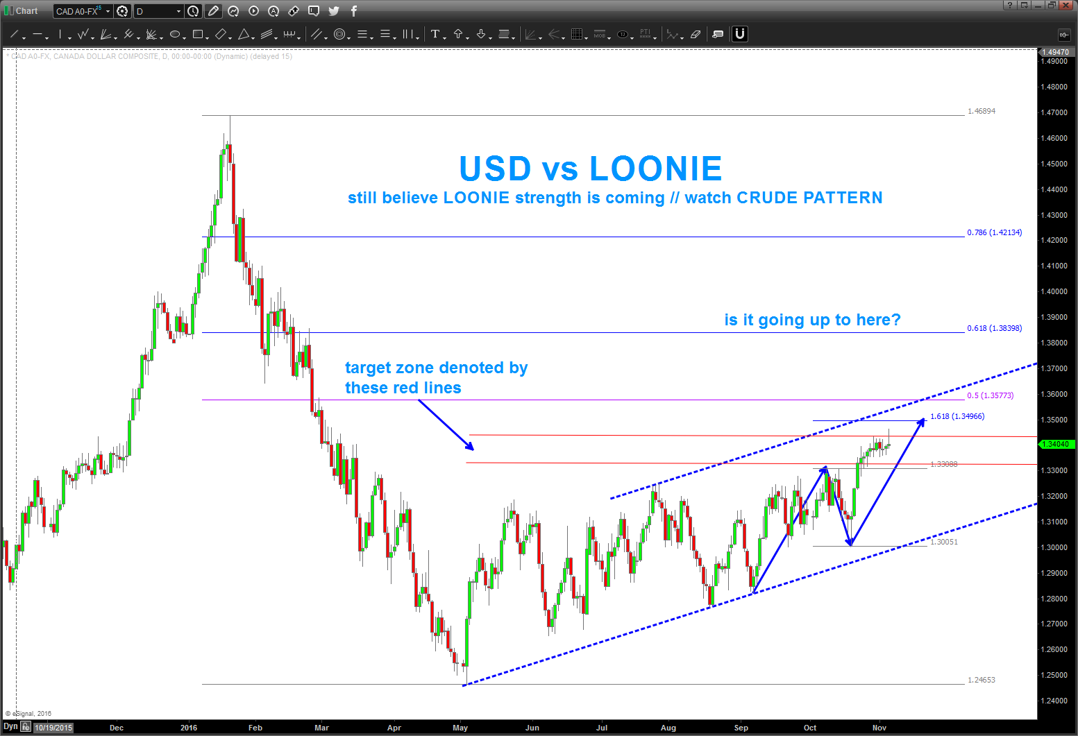 10/24/2016 – target hit on the USD vs LOONIE. Watch this one carefully. It “appears” that everyone is thinking of a big breakout but, as you can see, we had multiple targets coming into play and they were hit today.