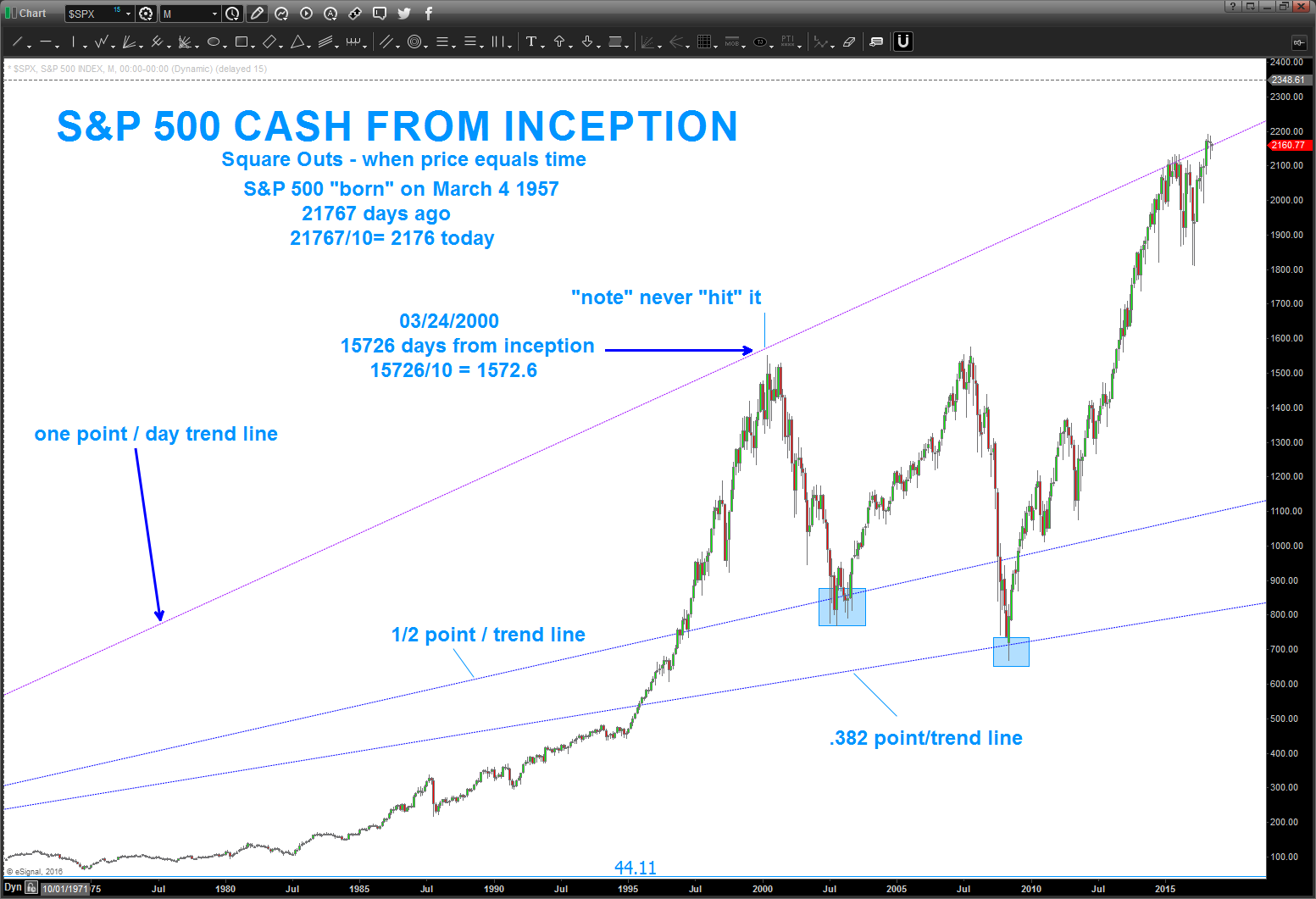 10/7/16 – just wanted to check in before the weekend. below is a chart that “visually” depicts the SQUARE OUT where PRICE EQUALS TIME and the TREND LINE you can create. In this case you can see the 1×1 is currently the REASON for the resistance on the S&P and then we simply did a 1/2 point/day and, why were were at it, a .382 point/day. HINT – why not try “musical notes” *days since inception or all time low. I bet, if we use, say .9438*days we’ll get close to the 2000 high and, while were are it, 1.05946*days we’ll be resistance on the cash S&P. It’s early on the West Coast … I don’t feel like doing it. Try it yourself.