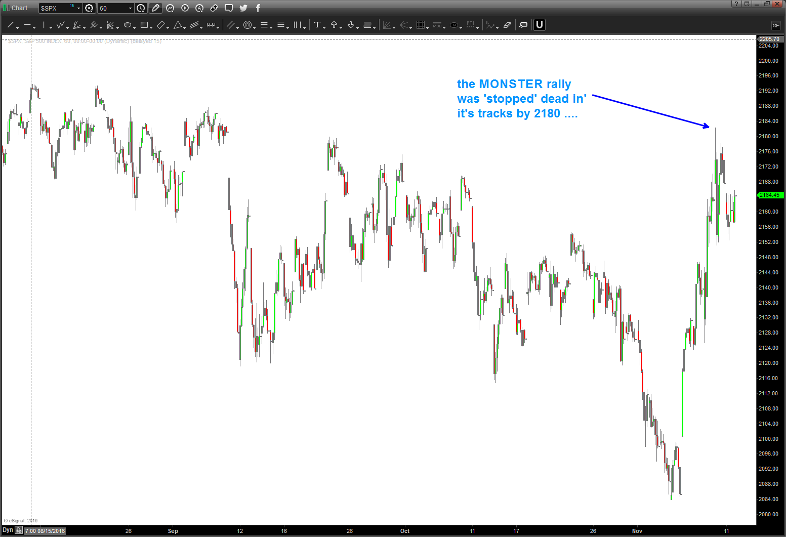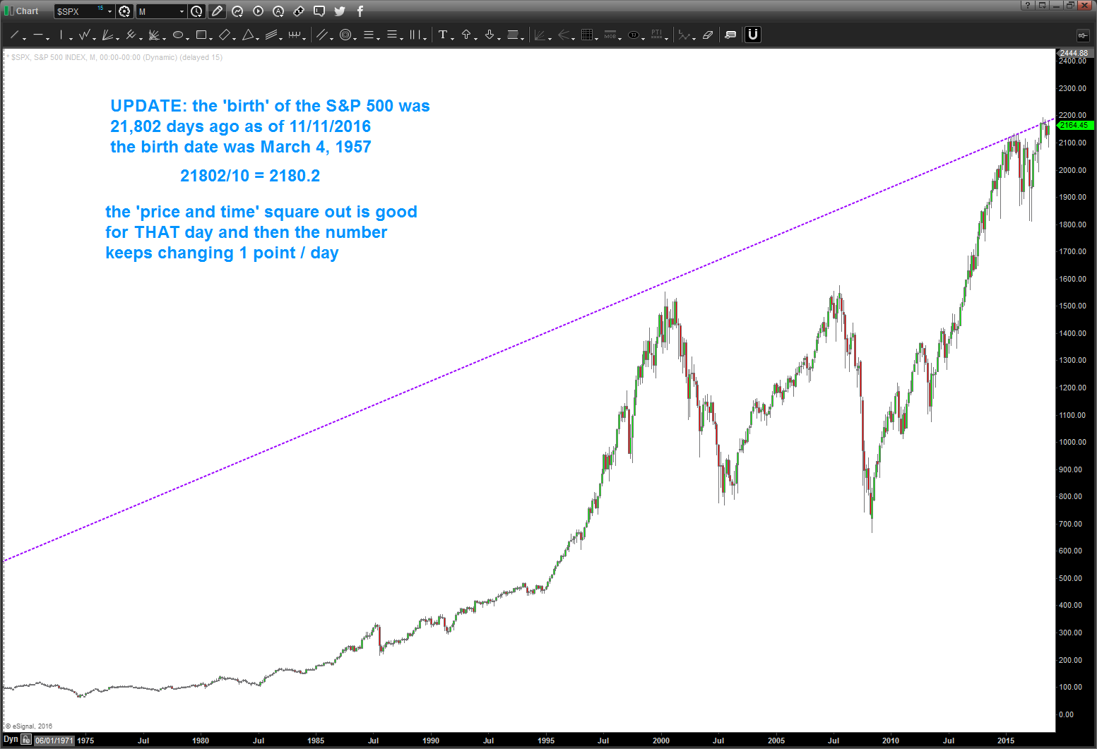 11/12/2016 – wanted to provide an update. the ‘square out number’ isn’t static. in fact, it changes every day. in this case, as we continue vortexing thru space we see that we are now, essentially, 2180 days since the ‘birth’ of the S&P 500. Of note, the post election crazy rally was stopped dead in it’s tracks by 2180. that’s the ‘key’ number right now … the market ‘wants’ to balance itself (remember: form, proportion, balance) so it’s no real surprise that the market went right up to that NUMBER.