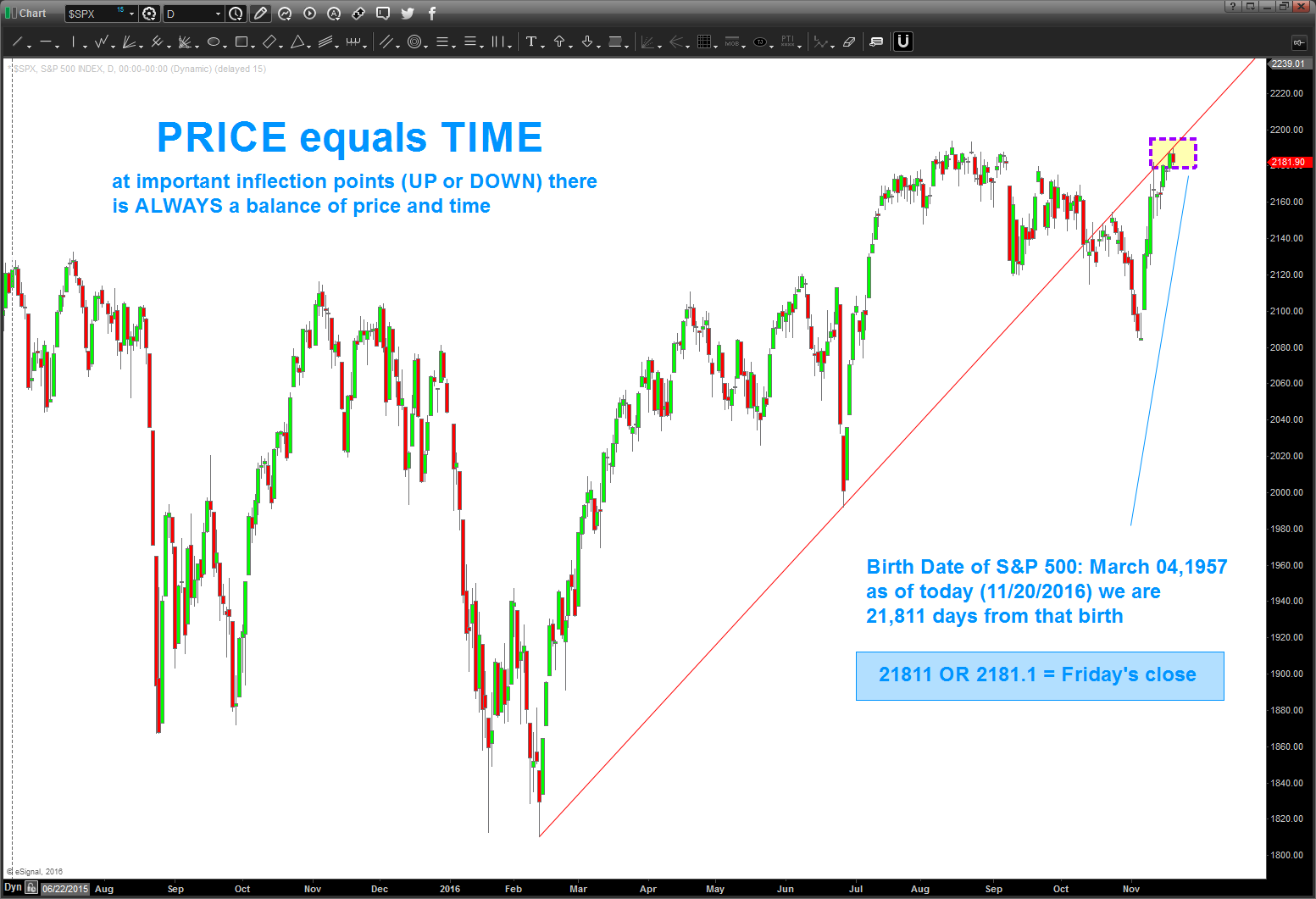 11/12/2016 – wanted to provide an update. the ‘square out number’ isn’t static. in fact, it changes every day. in this case, as we continue vortexing thru space we see that we are now, essentially, 2180 days since the ‘birth’ of the S&P 500. Of note, the post election crazy rally was stopped dead in it’s tracks by 2180. that’s the ‘key’ number right now … the market ‘wants’ to balance itself (remember: form, proportion, balance) so it’s no real surprise that the market went right up to that NUMBER.