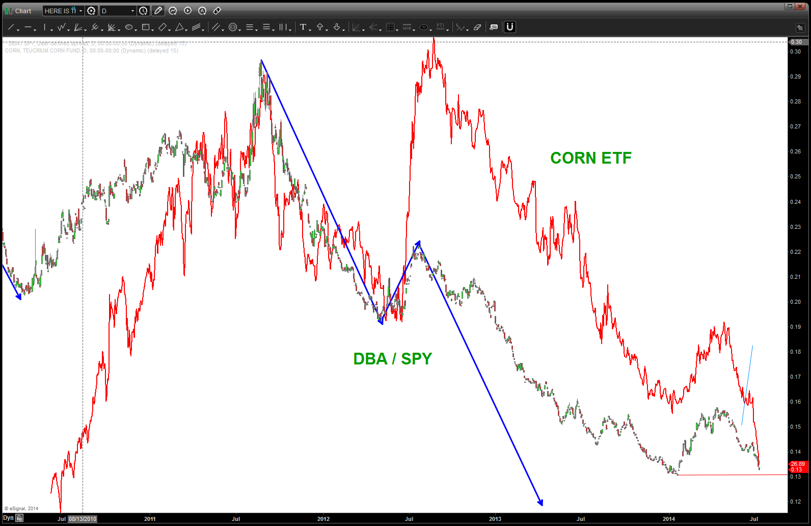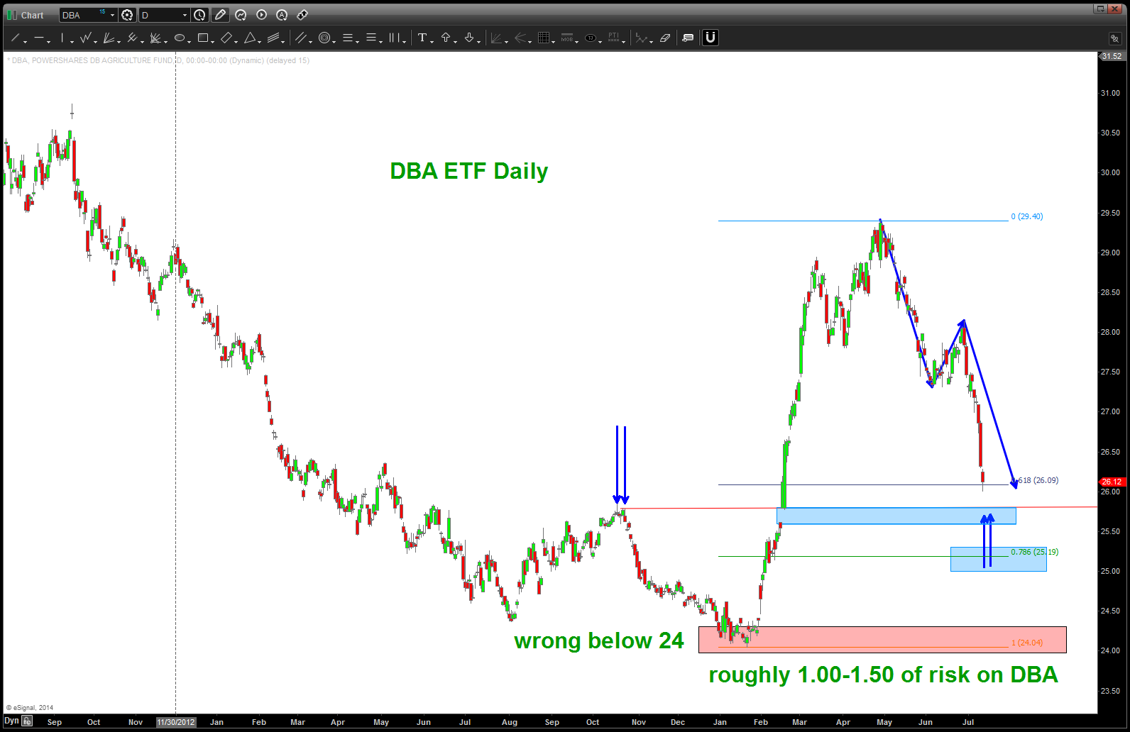 Amazing that it’s been a YEAR exactly since we took a look at the agriculture sector. The post below was from 06/26/2014. Based on the price action of DBA the past couple days and the action of the beans, wheat and corn believe it’s time to give DBA a shot. Would stop out w/ a close below 21.50.