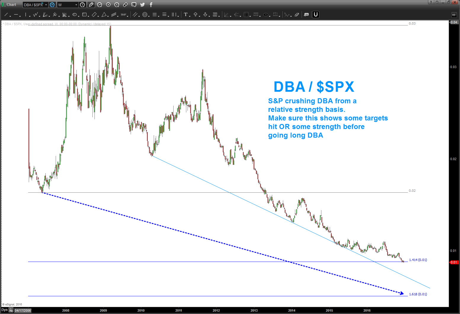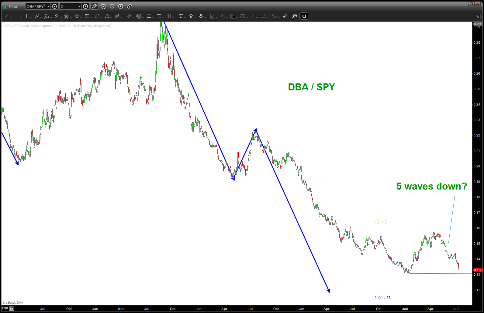 here is a quick look at the relative strength ratio between DBA/SPY. obviously, quite the thumping here BUT if you look you can see 5 waves down. if we break the swing low (sure looks like it’s going to happen) then we’ll go to that lower target I believe.
