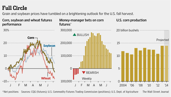 so, I don’t know ANYTHING about the inner workings of the grain market but I do know MEASURED MOVES and look at some of the beauties on Corn, Wheat, Soybeans. If we look a the “money manager” bets in the middle of the chart above it appears that NO ONE is bearish? Also, is the bushels projection that great? anyway, w/ extreme bearishness and this quote: