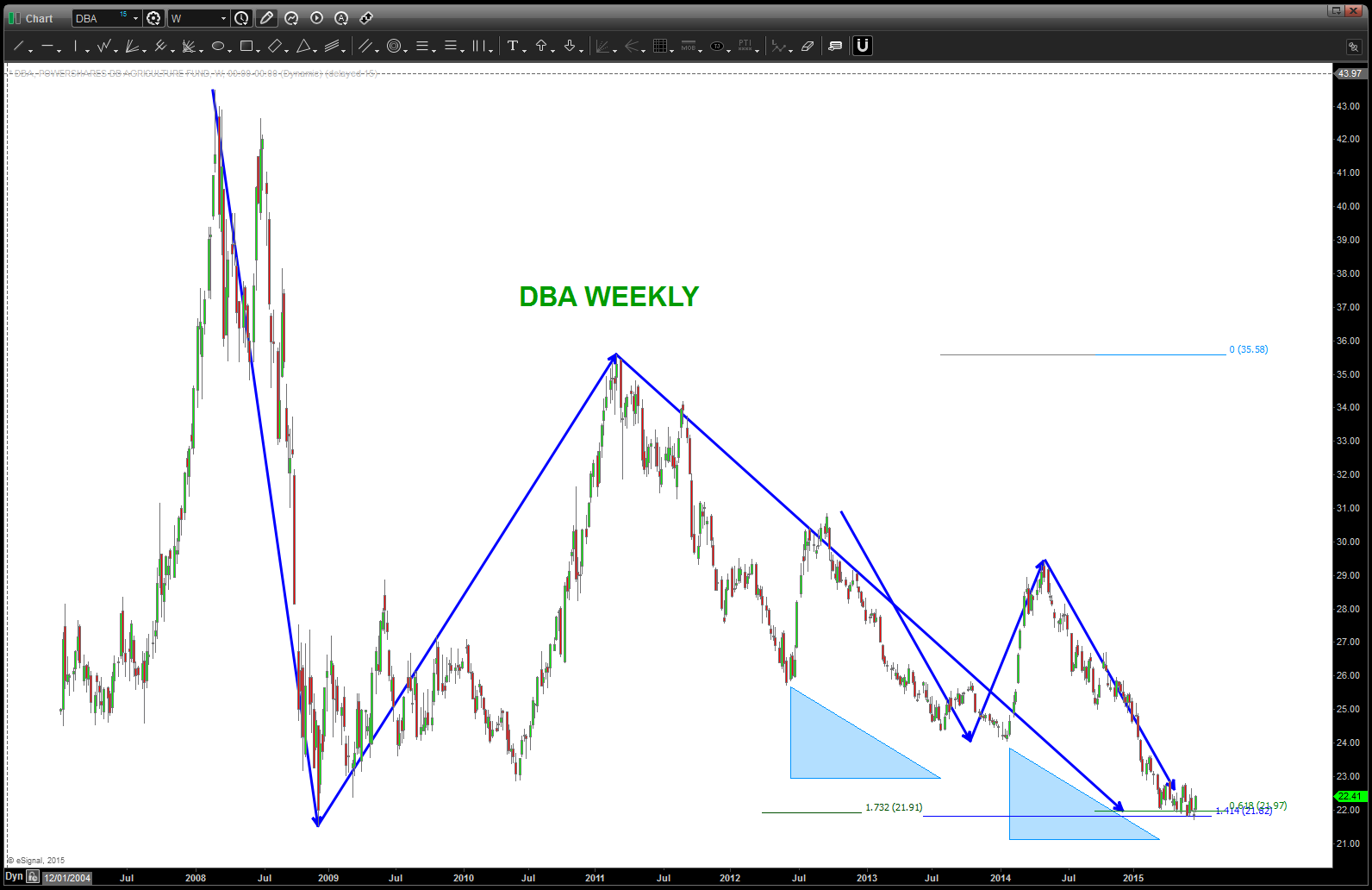 12/25/2016 – if you look closely at the 19/60 level the symmetry shows the potential for a double bottom. However, w/ a daily close below 19.60 it looks like DBA just isn’t ready. All the way down in/around 13 is the next BIG PATTERN. However, you can see the 17-18 level might offer a long shot. for now, consider this pattern from a while ago busted and DBA to continue to walk lower. we’ll give it another shot if /when the levels shown are hit.