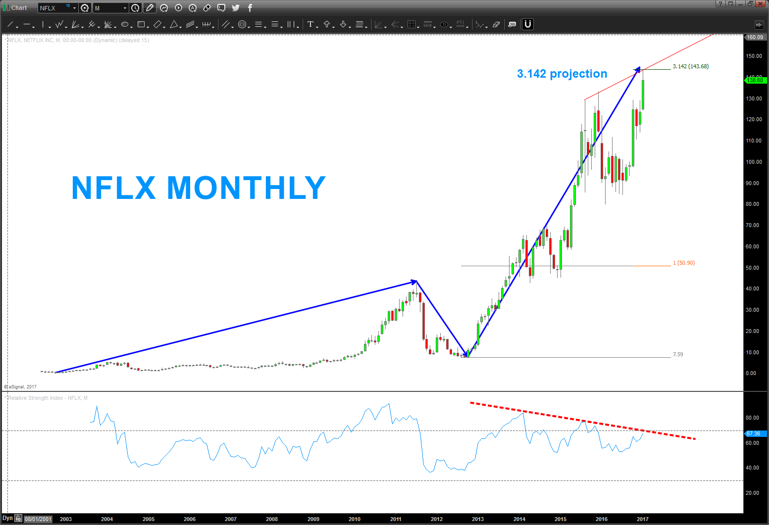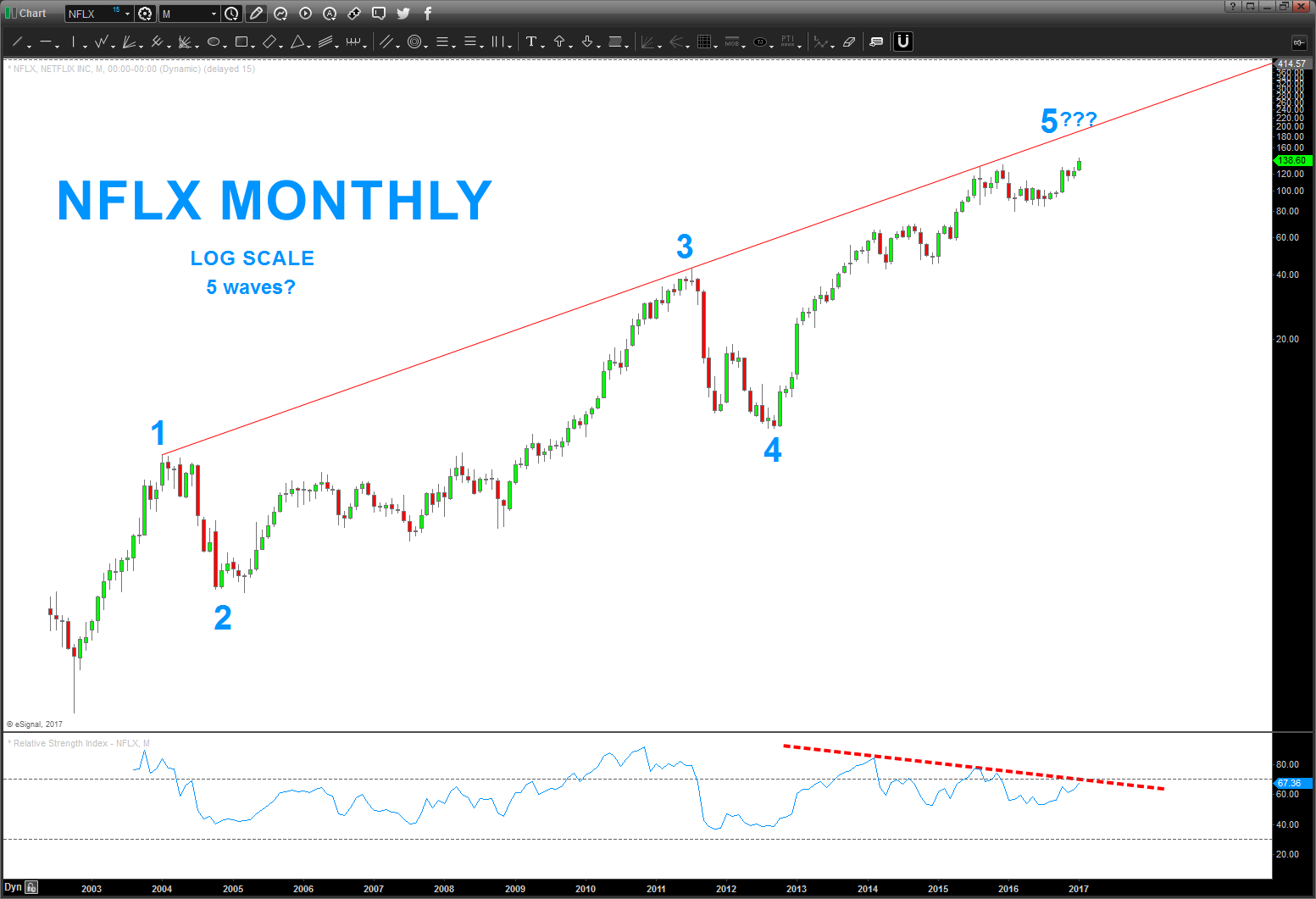 that being said, I hit erase all on $NFLX chart and took a fresh look at it … I still see 5 waves up w/ no RULES broken so the count is valid and there’s monthly bearish divergence and we are about to tag the upper long term trend line that is roughly 10 years old. I still say be careful up here but .. again … UNCLE.