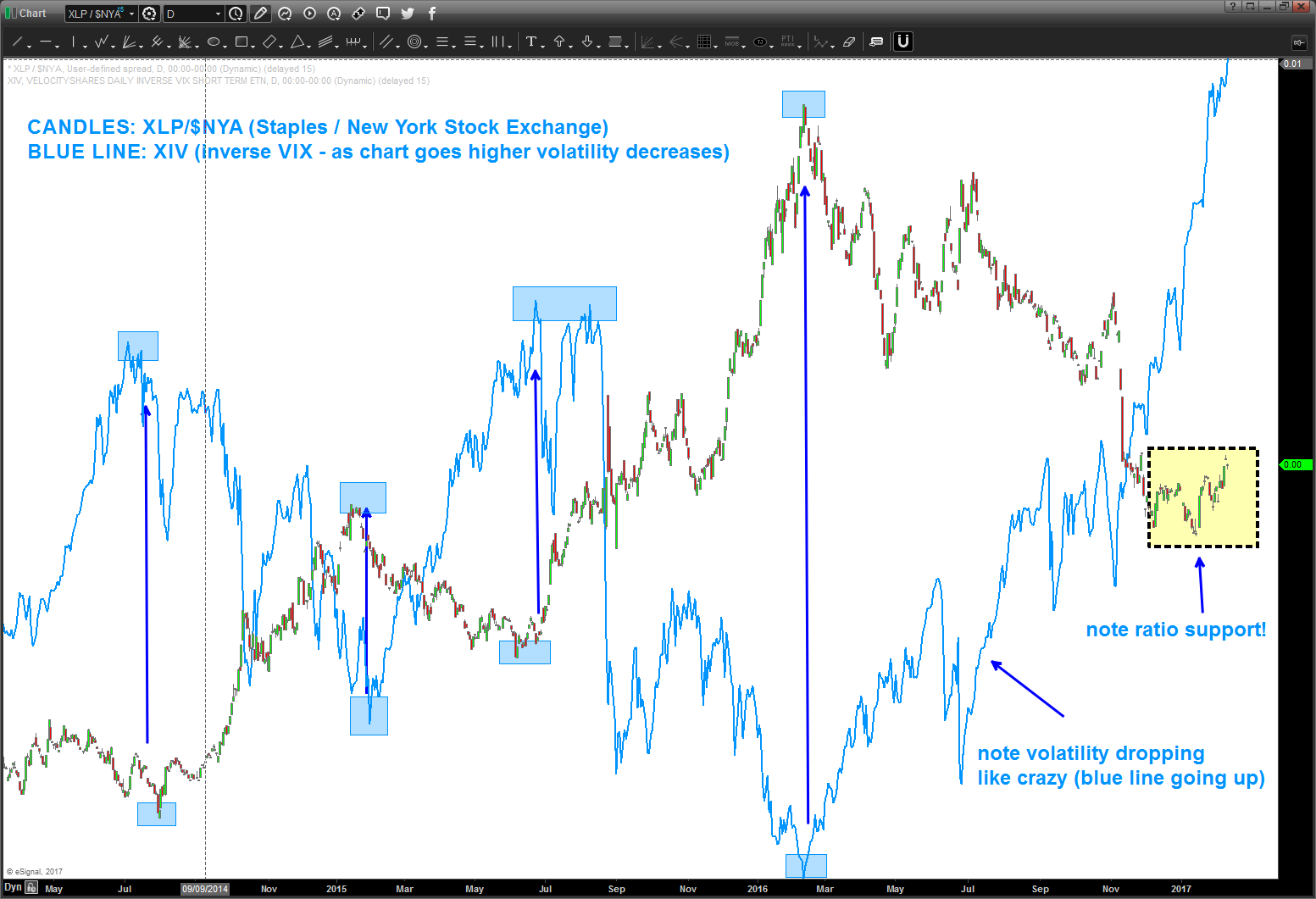 - NOTE: when the XLP / $NYA bottoms, the XIV goes down (volatility increases) and when the XLP/$NYA tops, volatility – as measured by the XIV – goes down the tubes.