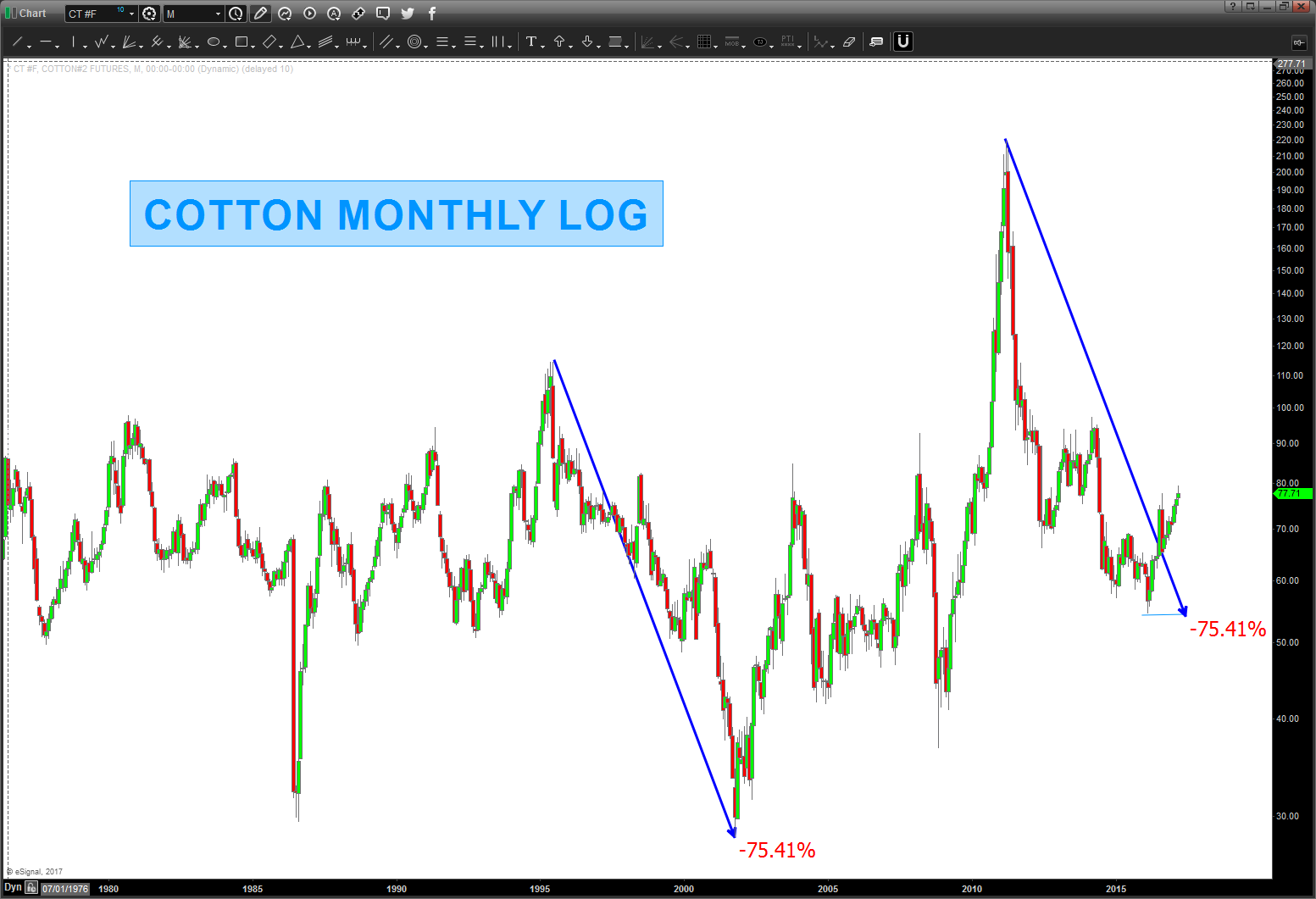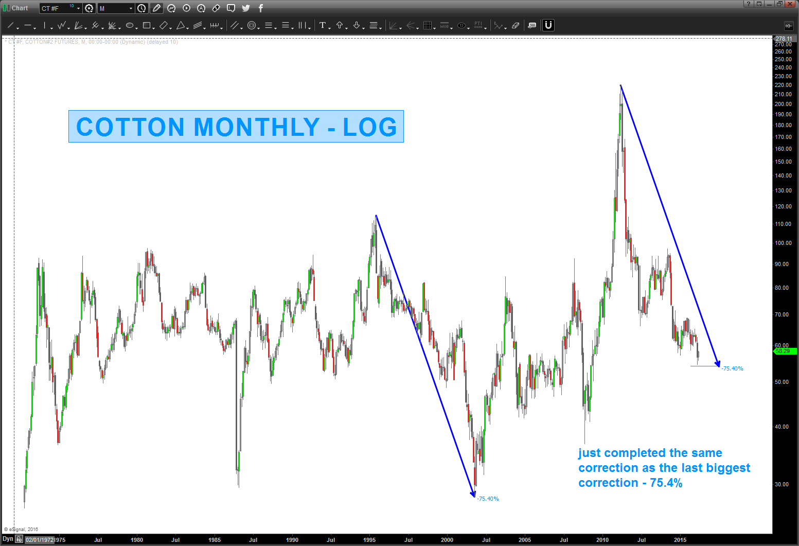 03/14/2016 – my good friend JC (www.allstarcharts.com) just blogged about cotton and it jogged my memory that 15 months ago I blogged about a low coming in cotton. (I’m good at timing, right? LOL) But, time is the key component and the PRICE level just completed the same corrective move (-75%) that represented the largest corrective move – EVER.