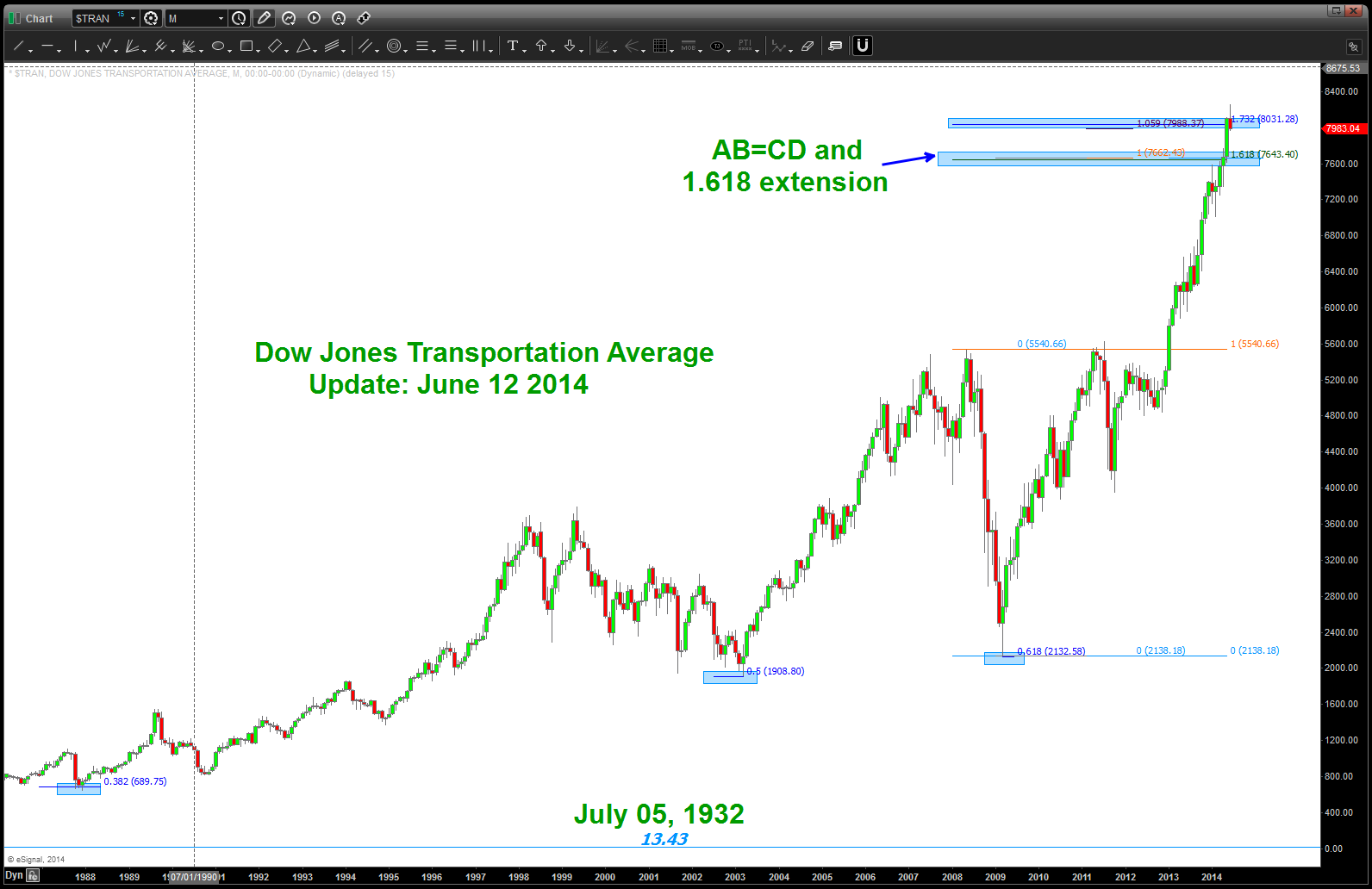 - my “job” as a PATTERN chartist is to do my best to find the patterns and then present them to you, my readers. (thanks for the following also) As a PATTERN chartist you are NEVER wrong. The PATTERN works or it doesn’t it … it has NOTHING to do w/ you. On long term time frames, well, the patterns are “easier” to construct. An all time low to a “former” all time high gives you AMAZING projection capabilities. In fact, it is one of our easiest PATTERNS to form – the “zig zag or AB=CD” PATTERN. Folks this formed on the Transports and got SMOKED … not even a token of resistance. Wow …