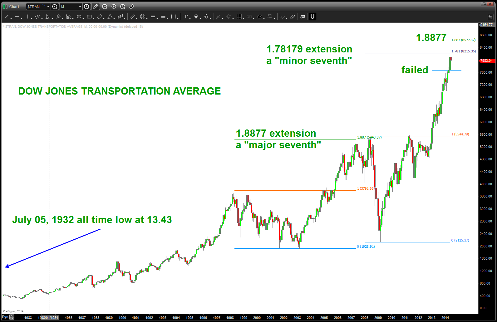 I went back to it tonight and I still think we have a pattern forming so I went back and said “self, what did it do the last time we surged past an old high and into a new high? Well, guess what? It surged thru the 1.618 extension in 2007-2008 an stopped on the 1.8877 extension! TILT … 1.8877? Well, that is exactly a major seventh ration in the equal octave scale of music. So .. perhaps it did that again? Please see below …we smacked into the minor and, quite frankly, the major is still out there. However — this sure looks like a MONTHLY 3 DRIVES TO A TOP pattern.