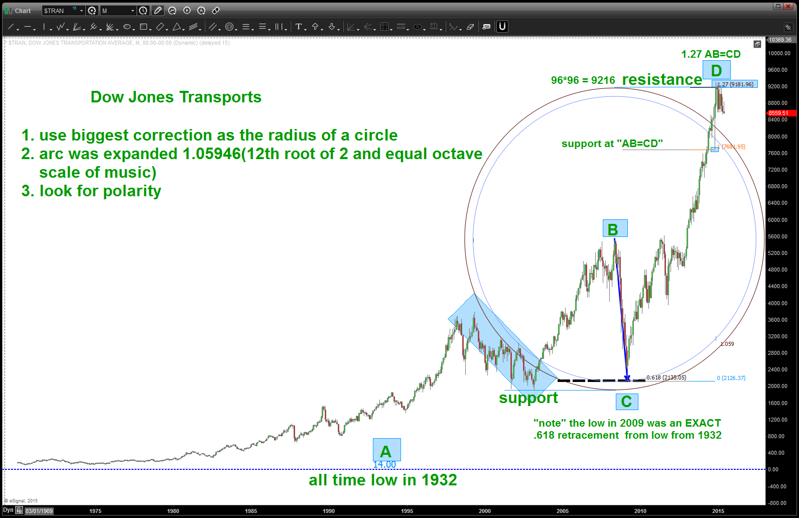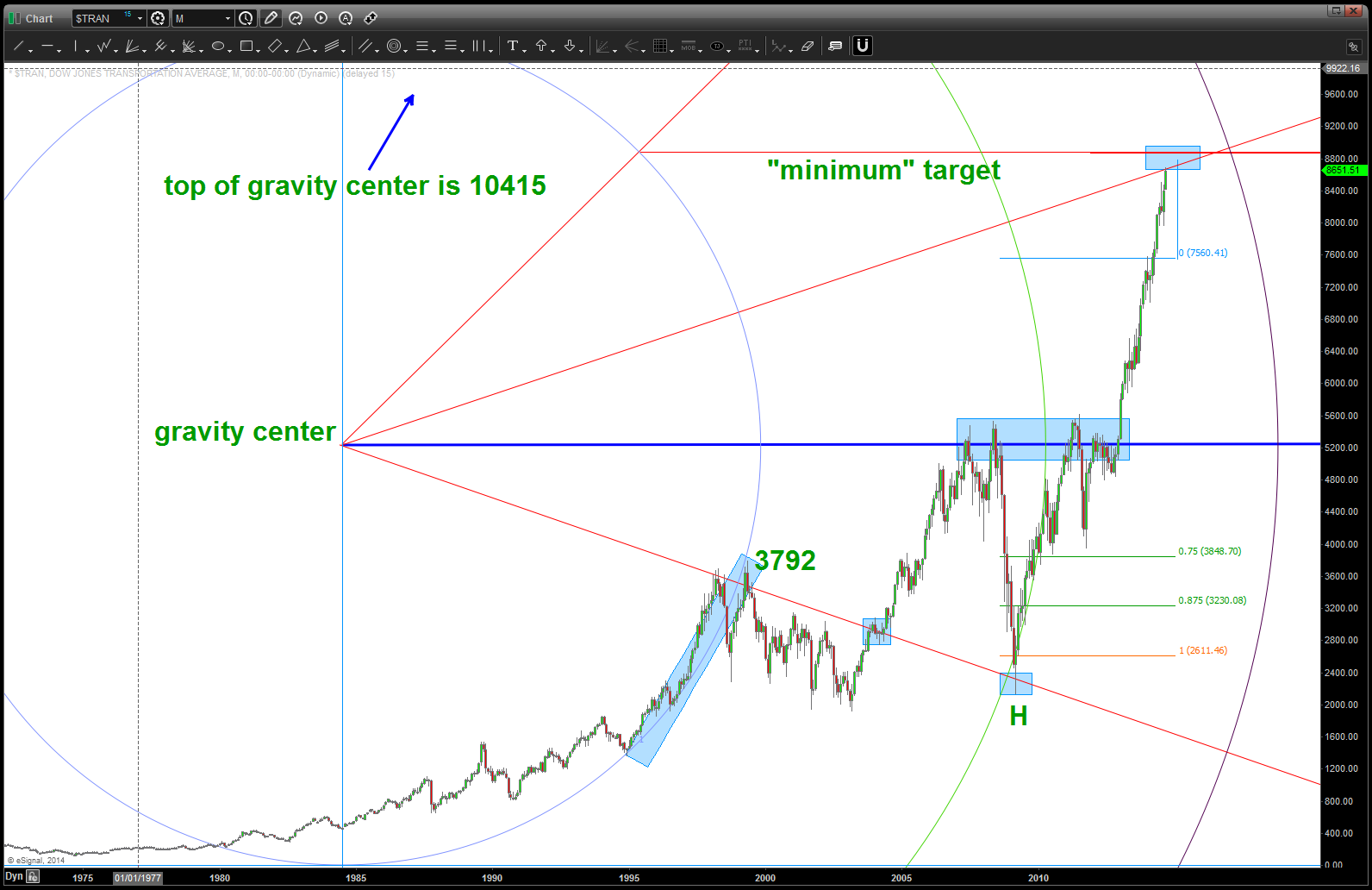 Since this move is going PARABOLIC it’s sometimes helpful to bring out the old geometry … this is simply the technique of how to draw a circle from 3 points. (full disclosure: I have NO IDEA where the GRAVITY CENTER is going to end up.) Note, when using this technique our gravity center is, basically, the zone for the past major top in the Transports.