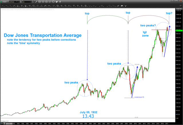 04/06/2017 – Transports hit the below resistance zone and targets and have since rallied to make new highs. What’s interesting this time is the time symmetry between the peaks in 1999,2008 and now. Also, note that they seem to always want to go up and make a slight new high before further correcting.
