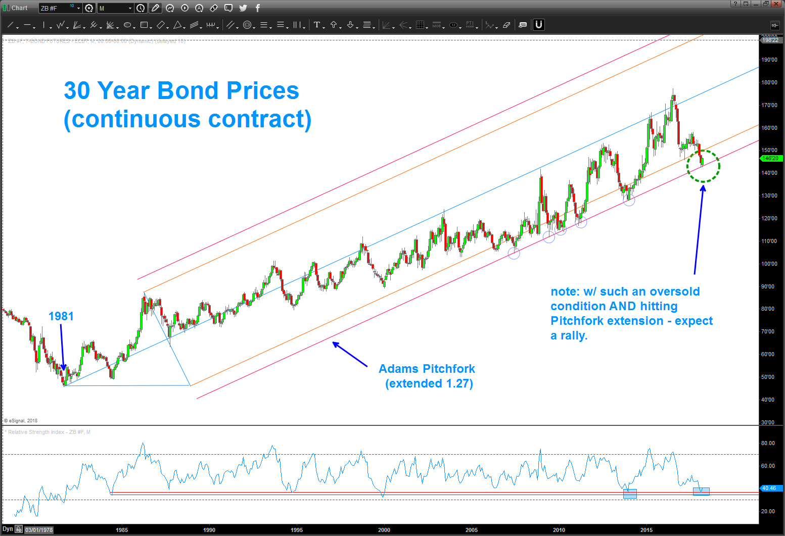 note, the prices bounced nicely off the long term Pitchfork (extended 1.27) and w/ the RSI buried deeply, this ‘bounce’ might surprise some as we work off an extreme oversold (monthly) condition since 1985. I still hold out that we have a MAJOR top in the Bond Complex and this is an opportunity to go long rates (short bonds) in the coming weeks.