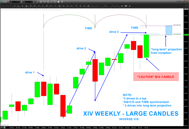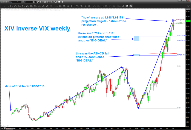 Below, calling out a very nice 3 drive to a top w/ price and time symmetry and, additionally, the XIV is smacking into 1.618/1.68179 projections from the date of inception. Man, if it smacks into this level and keeps rolling it’s going to be Space-X rocket.