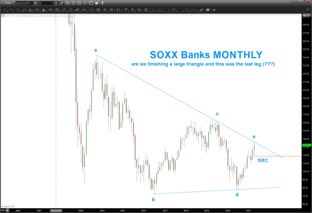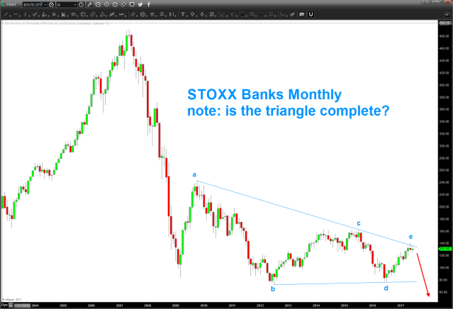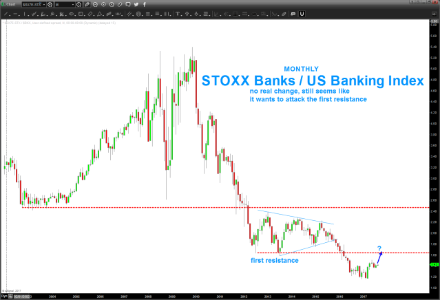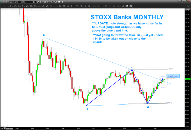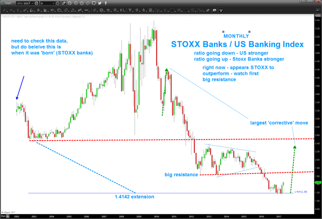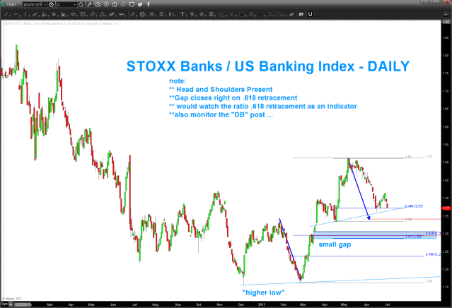 07/01/2017 – STOXX banks rallied into the target zone to keep the triangle (monthly) thesis alive. key levels indicated below on STOXX Banks and also the STOXX / US Banking Index. Hawk these levels for strength or weakness.