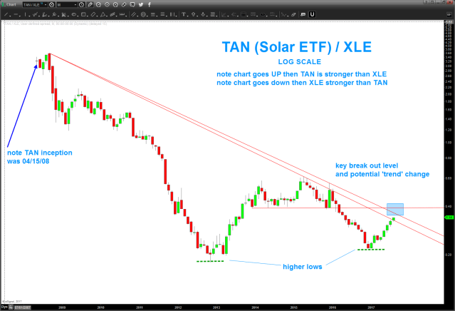 frankly, I never even looked at them before … so after reading the post I thought ‘why not do a TAN (solar ETF) / XLE (energy) ratio and see what it tells us …