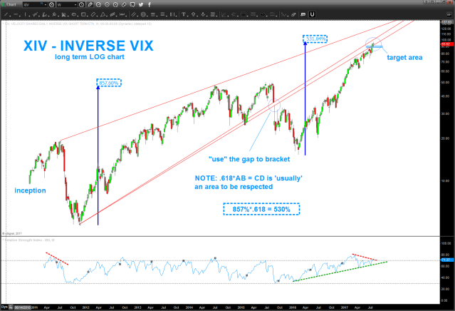 Below, calling out a very nice 3 drive to a top w/ price and time symmetry and, additionally, the XIV is smacking into 1.618/1.68179 projections from the date of inception. Man, if it smacks into this level and keeps rolling it’s going to be Space-X rocket.