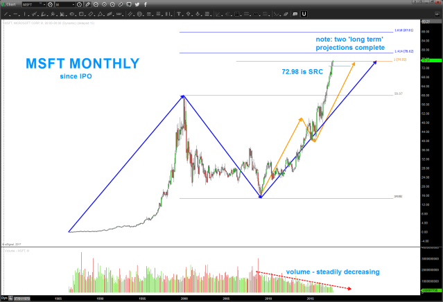 09/16/2017 – MSFT has hit and, as of now, closed above (albeit slightly) above the long term price projection levels. Next week will ‘make or break’ in my mind this monstrous bull run. IF this puppy stops in/around here would wait for a monthly SRC (signal reversal candle) to make any move .. that’s roughly a WEEKLY close below 73. Also, threw some volume up to see if they are buying this puppy like crazy … note, the steady decrease in volume during this run …
