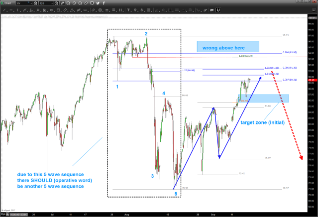 09/04/2017 – as you can see by the chart below the XIV is forming a ‘classic’ sell signal. If you look closely (not labeled here) we can see a 5 wave count down. w/ this rally, we should expect another wave lower. that’s what ‘should’ happen BUT you never know.