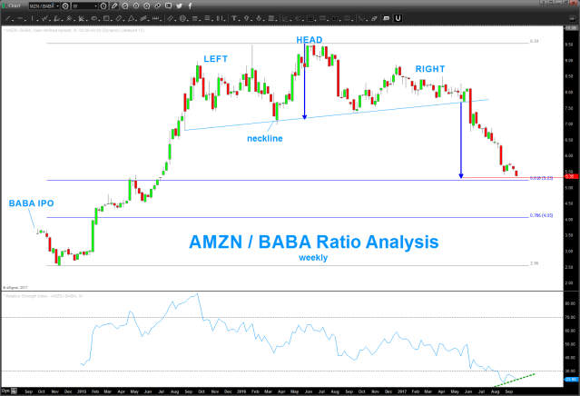 as you can see … AMZN took the strength from BABA for about a year .. then they were neck-in-neck (shown as the H+S developing) then in June 2017 BABA took off and started to outperform …