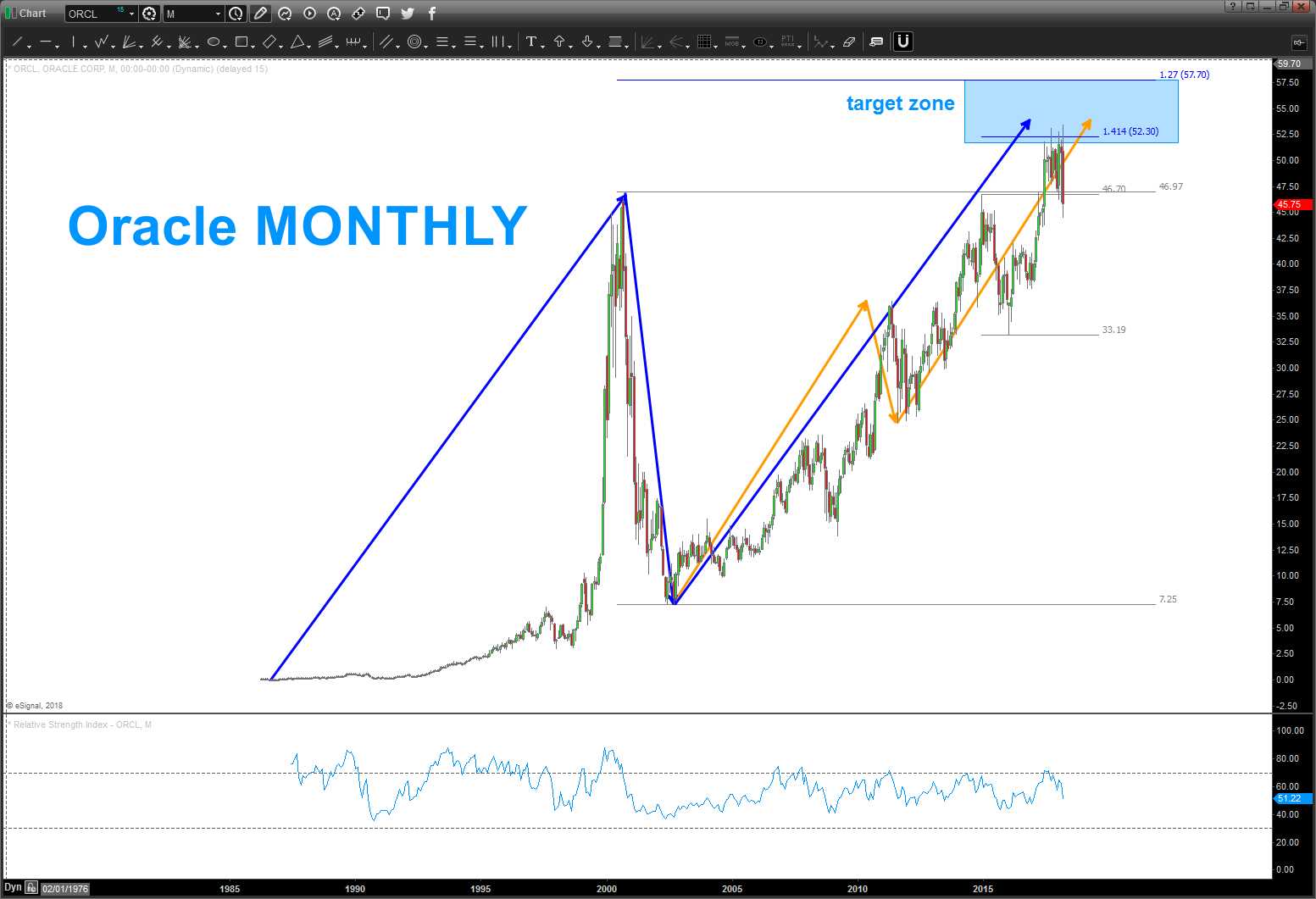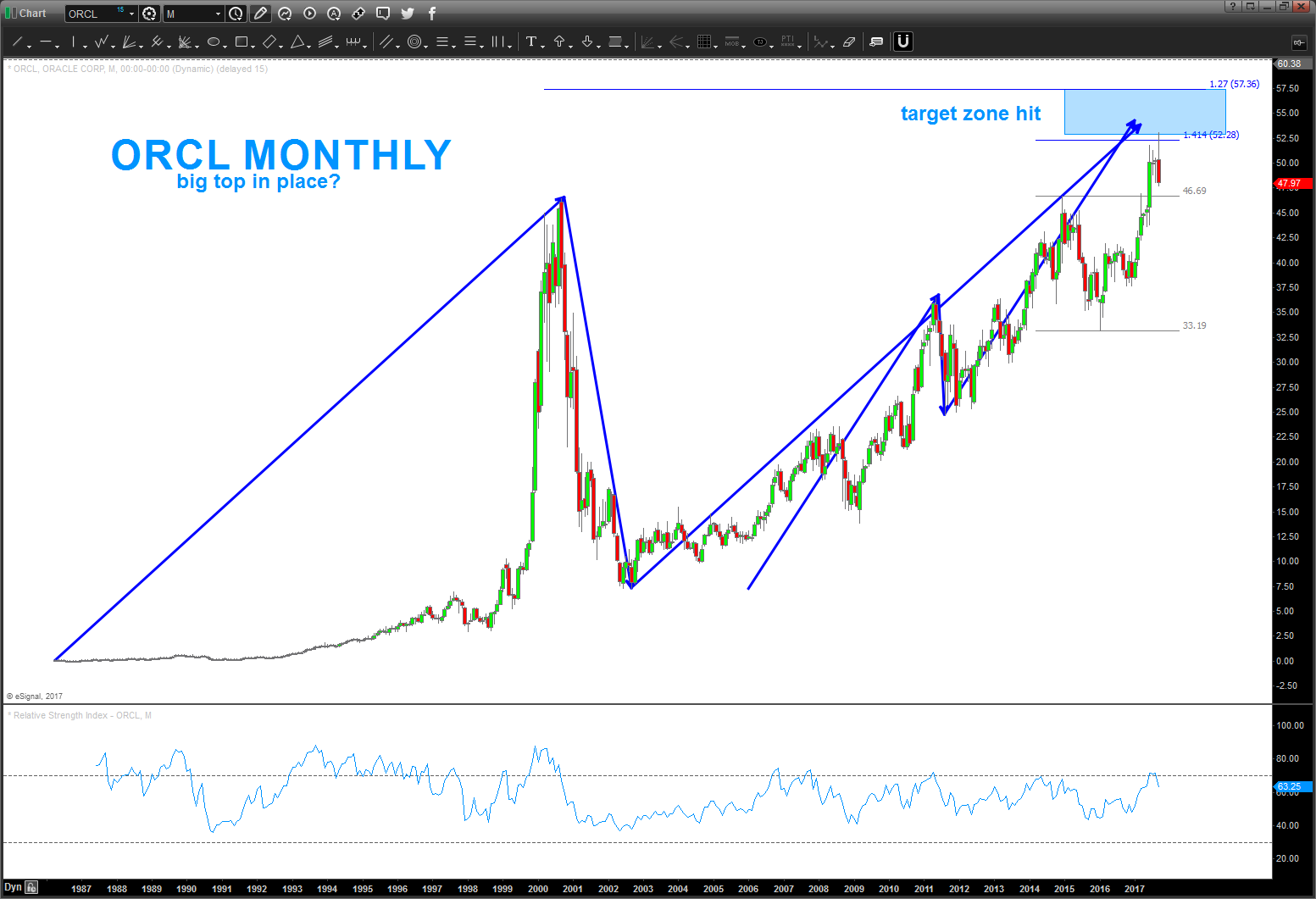 September 25, 2017 – trust me, back in December 2014 I didn’t have a clue if 53-56 would ever be hit … target area has been hit and I have no earthly idea what the fundamentals are driving this stock or not … watch the MONTHLY close on this one. If we get a MONTHLY SRC, then we could have a pretty big top in ORCL.