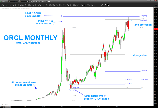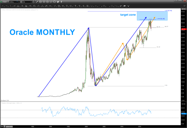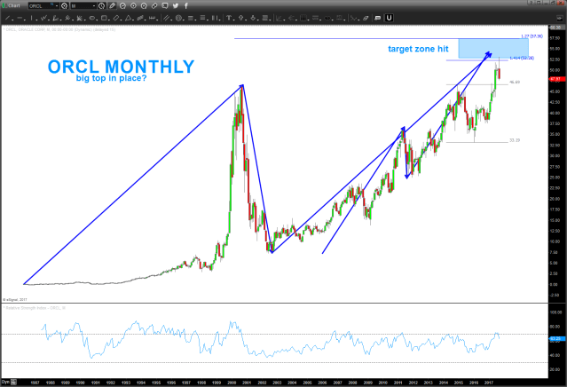 04/01/2018 – update to ORCL chart below. Looks like it wanted to go up and finish the ‘long term’ projection. we have a monthly signal reversal candle as of Thursday so this one could very well be cooked for now. Still have the upper area for targets but risk is to the downside. Now, I have no idea what fundamentally happened to cause such a sell off. What I can say is that almost 4 years ago these NUMBERS and this PATTERN were forecasted to cause a top/resistance. So far, they have.