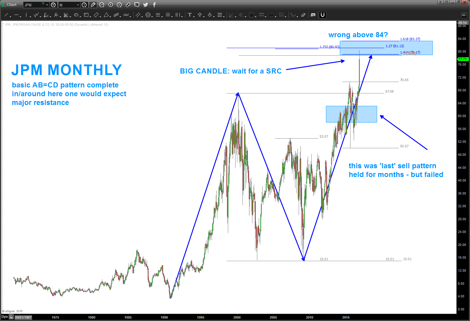 now, since the election, JPM has vaulted out of the gate into the ‘big AB=CD’ and extension area … because of such a big candle coming into this level, it begs of caution if trying to short – perhaps look for a weekly or daily signal reversal?