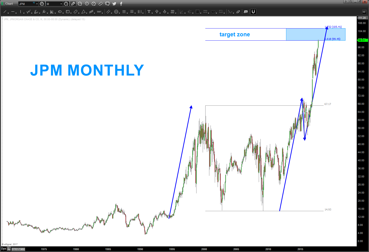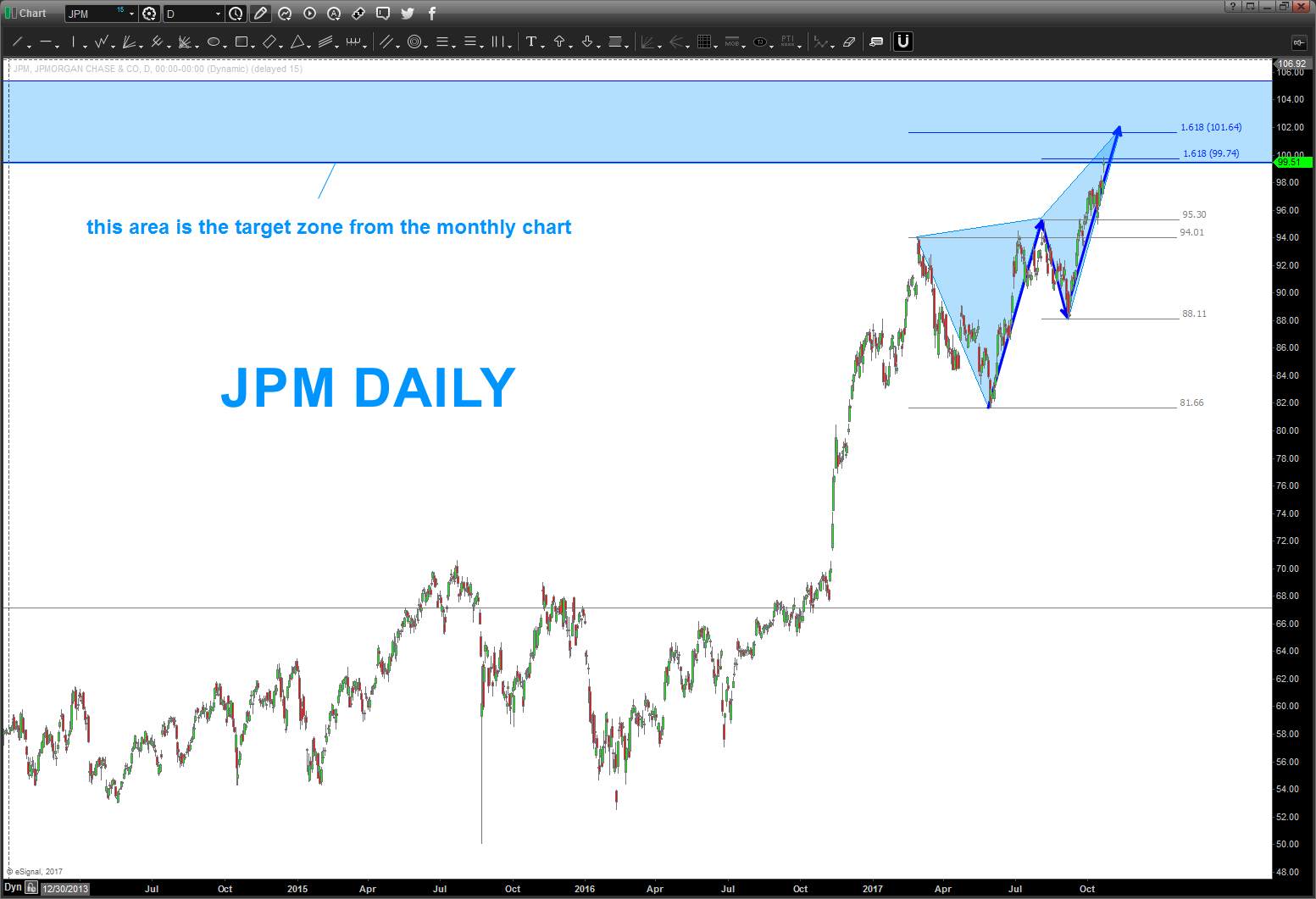 10/21/2017 – around a year ago the pattern below was defeated by JPM. as you can see from November 2016 it was a pretty big candle coming into this level.