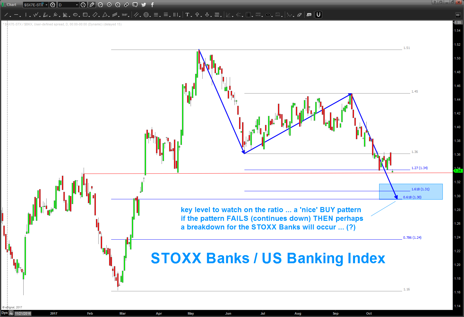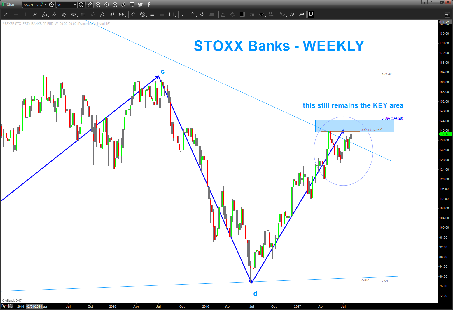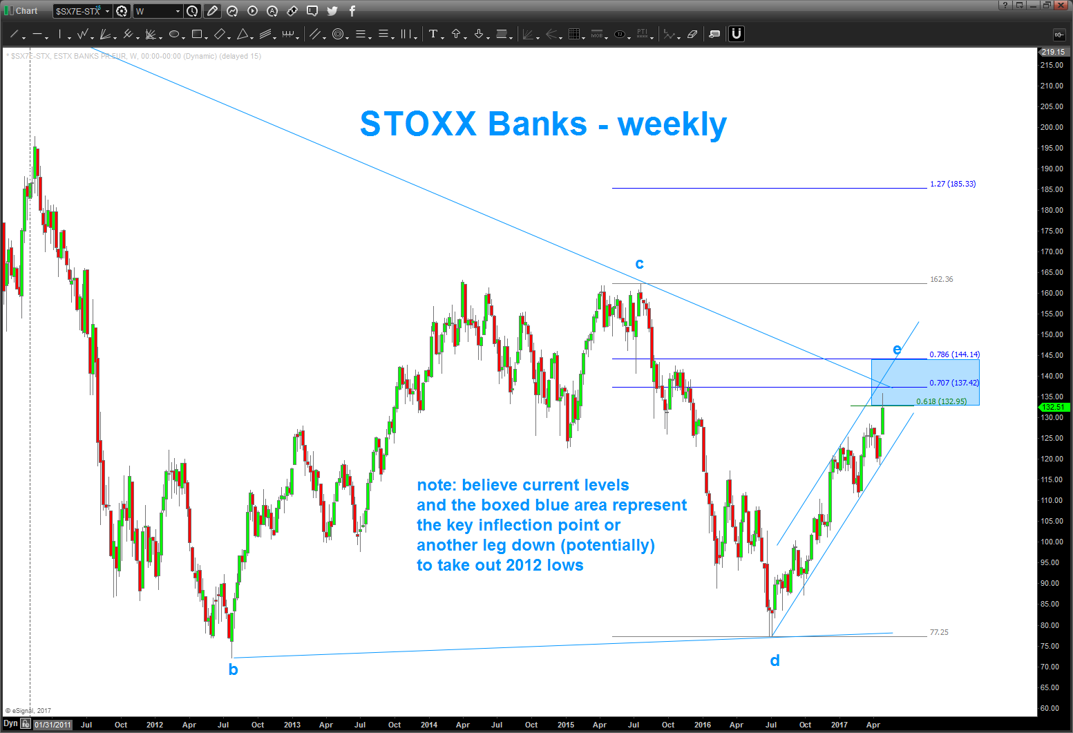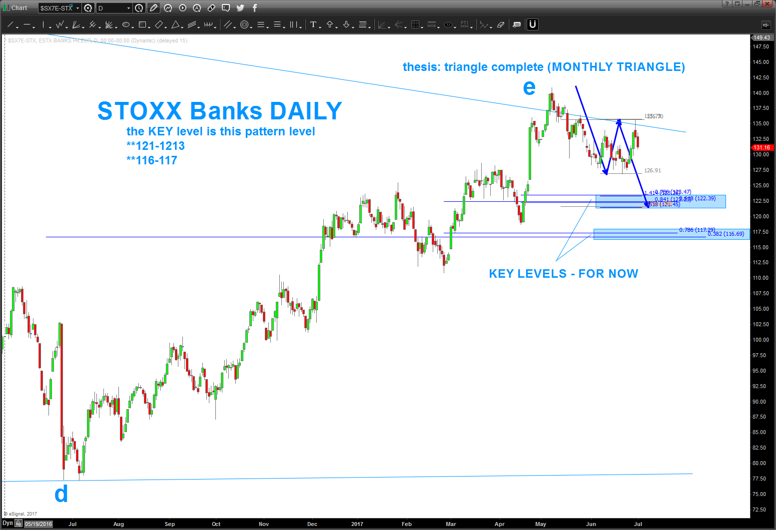 07/01/2017 – STOXX banks rallied into the target zone to keep the triangle (monthly) thesis alive. key levels indicated below on STOXX Banks and also the STOXX / US Banking Index. Hawk these levels for strength or weakness.