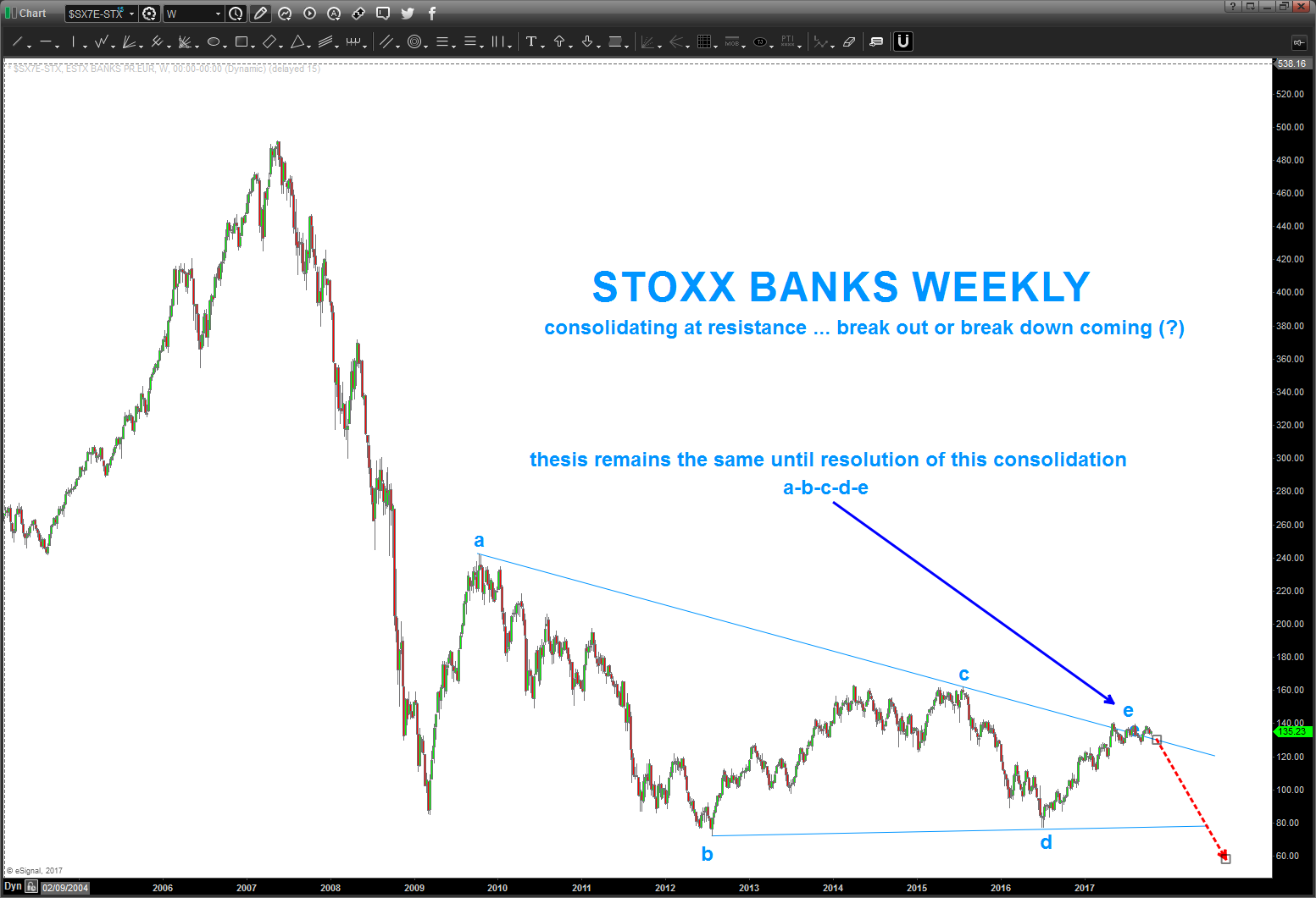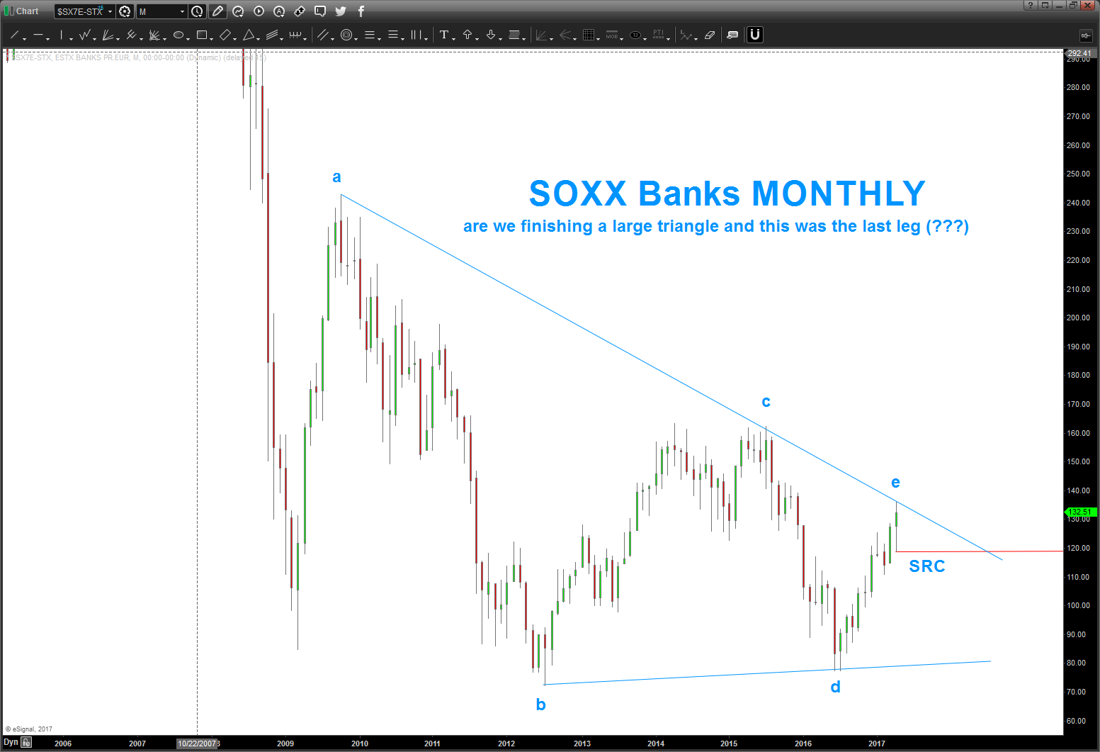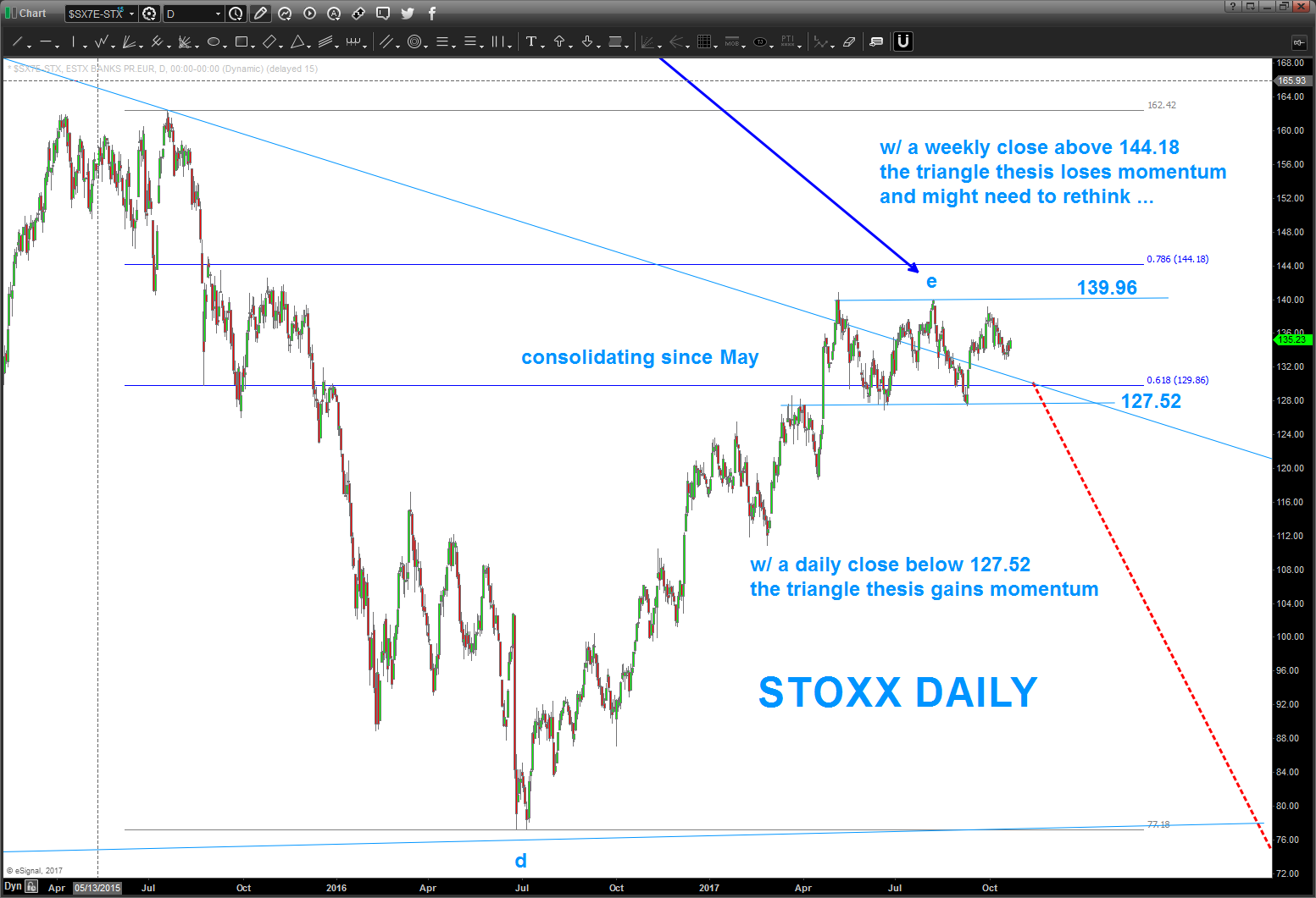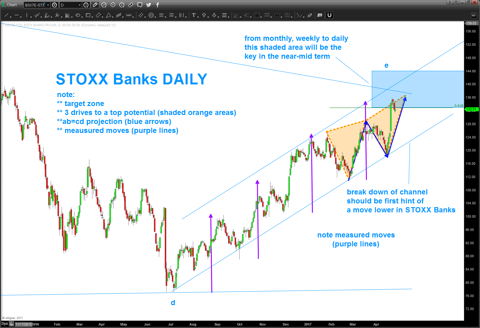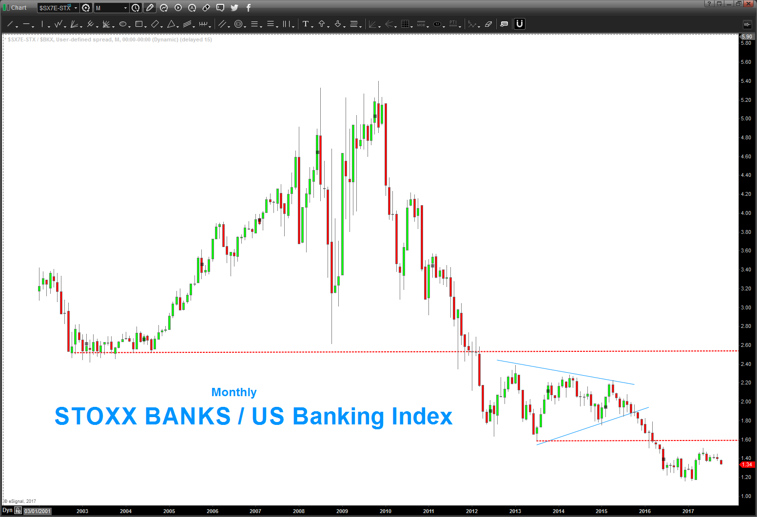 07/01/2017 – STOXX banks rallied into the target zone to keep the triangle (monthly) thesis alive. key levels indicated below on STOXX Banks and also the STOXX / US Banking Index. Hawk these levels for strength or weakness.