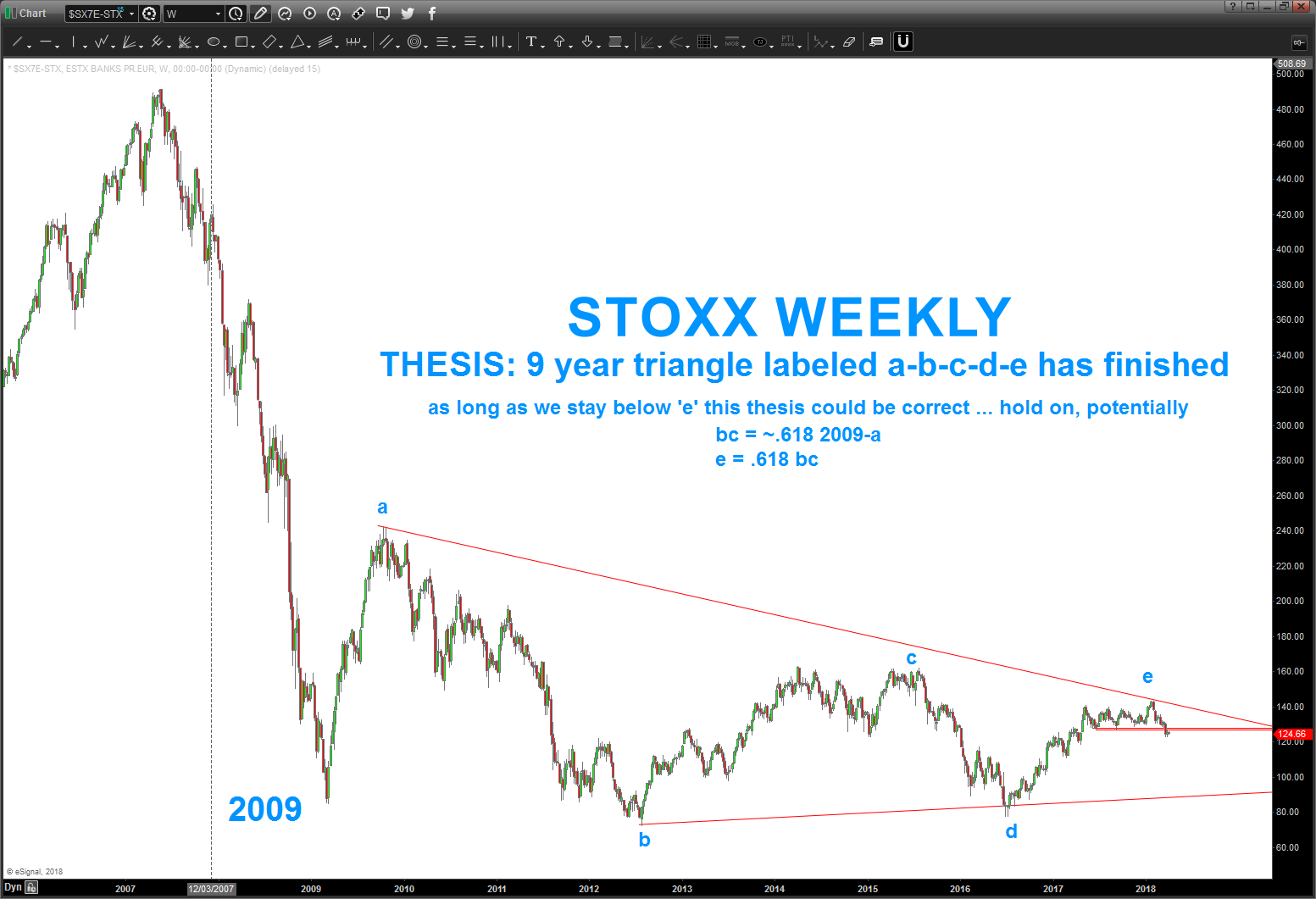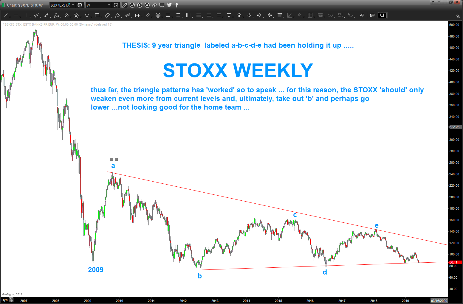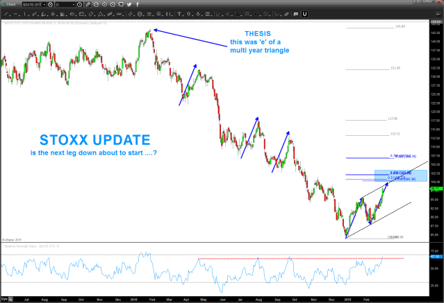 02/28/2019 – well, pattern recognition says you should always BUY or SELL the first AB=CD in an up or down trend. well, the STOXX Banks are almost there w/ regard to an AB=CD sell pattern. So far, the ‘thesis’ around a multi year triangle has worked which means, ultimately, this index will plunge to new lows lower than 20012. Is the next leg down upon us … if the PATTERN works, then yes. If it doesn’t we’ll CTRL-ALT-DEL and look for another pattern. HEADS UP OVER THERE ACROSS THE ATLANTIC!