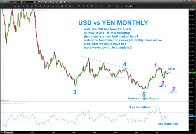 10/22/2017 – we discussed the ‘RSI SHIFT’ below. taking note of it again …have been on the sidelines w/ regards to the USD vs YEN as I’m waiting for resolution of the downtrend line shown …