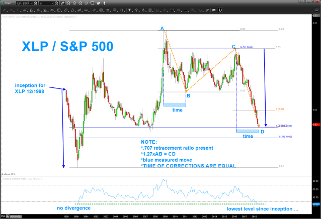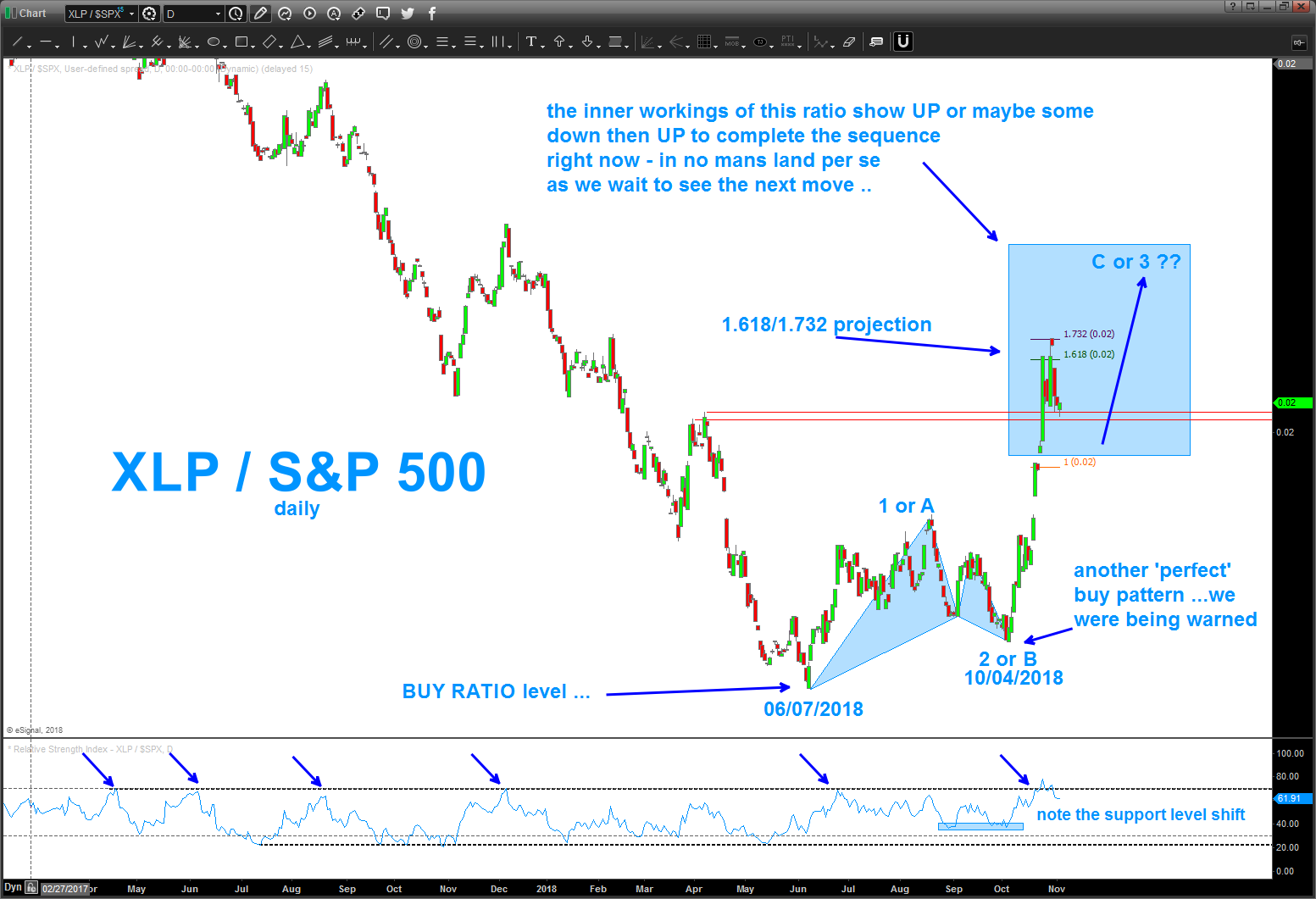 11/04/2018 – back on June 09, 2018 we saw this – almost – perfect pattern hit support. it’s the ratio of XLP / S&P 500 – we use ratio analysis to look for ‘risk on’ or ‘risk off’ mindset from the big dudes. in times of ‘risk on’ the ratio will go down as the big dudes / dudettes are not in defensive names (like staples) and when the ‘risk off’ mindset is present then the ratio will go up. i.e. the XLP is ‘outperforming’ from a relative strength perspective. the ratio completed a harmonic BUY pattern back in June and it took another 4 months before the market topped. one could conceivably say the rotation occurred in the summer. I’m posting the updated chart below … try and follow the bouncing ball of CONFIRMING indicators that the ratio was bottoming ….