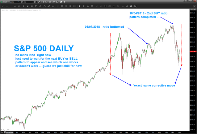 where are we now? as you can see on the daily below we were DEFINITELY being warned w/ another near perfect BUY pattern on the ratio 10/04/2018. it exploded higher … I see a little more consolidation/ corrective form in the ratio an then another move higher to complete an inner 5 wave sequence. that’s when the ‘real’ pattern emerges. I DO NOT KNOW, yet, if this is an Elliott A-B-C corrective move (bullish for stocks) or a 1,2,3,4,5 wave sequence that foreshadows the ratio going higher (bearish for stocks) … were just going to have to chill and wait to see what unfolds.