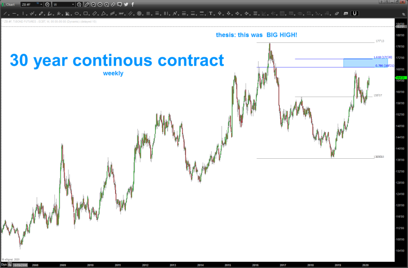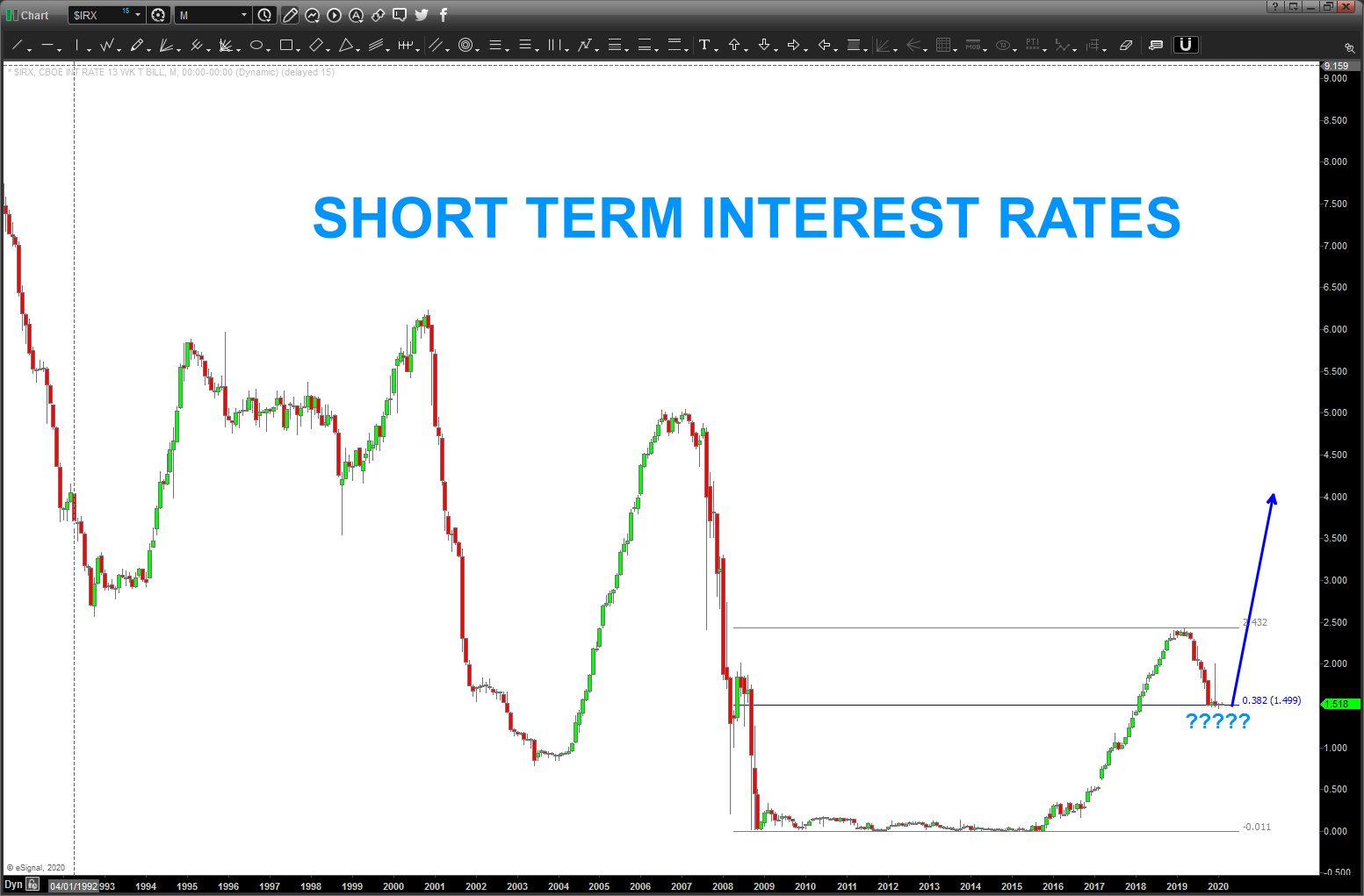 here’s a monthly of short term interest rates, sitting right on a .382 retracement. IF a STRONG MOVE HIGHER THEN .382 should/could hold it
