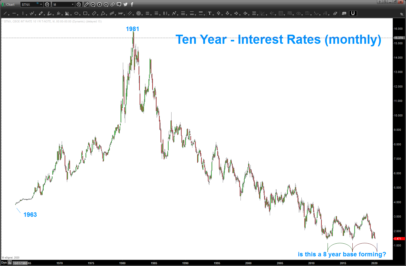 here’s the 10 year rates chart going back to the 1960’s … only thing I want to note is 1/ it’s been STRAIGHT down w/ intermittent ‘bounces’ but 2/ of late, notice we have pretty much – technically – been forming a key support CLIFF (and it is that ) around 1.5% and it’s been trying to base for around 8 years. nothing from a time perspective compared to 5000 years BUT maybe something for us to watch, closely, for a 40 year wave of lower interest rates?