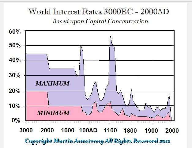 I also follow Martin Armstrong of Armstrong Economics and he posted this graph which shows interest rates are at 5000 year lows. so, per the title of this post, we have a 5000 year trend working w/ regard to the ‘trend’ of interest rates. folks, work w/ me, but that’s a trend!