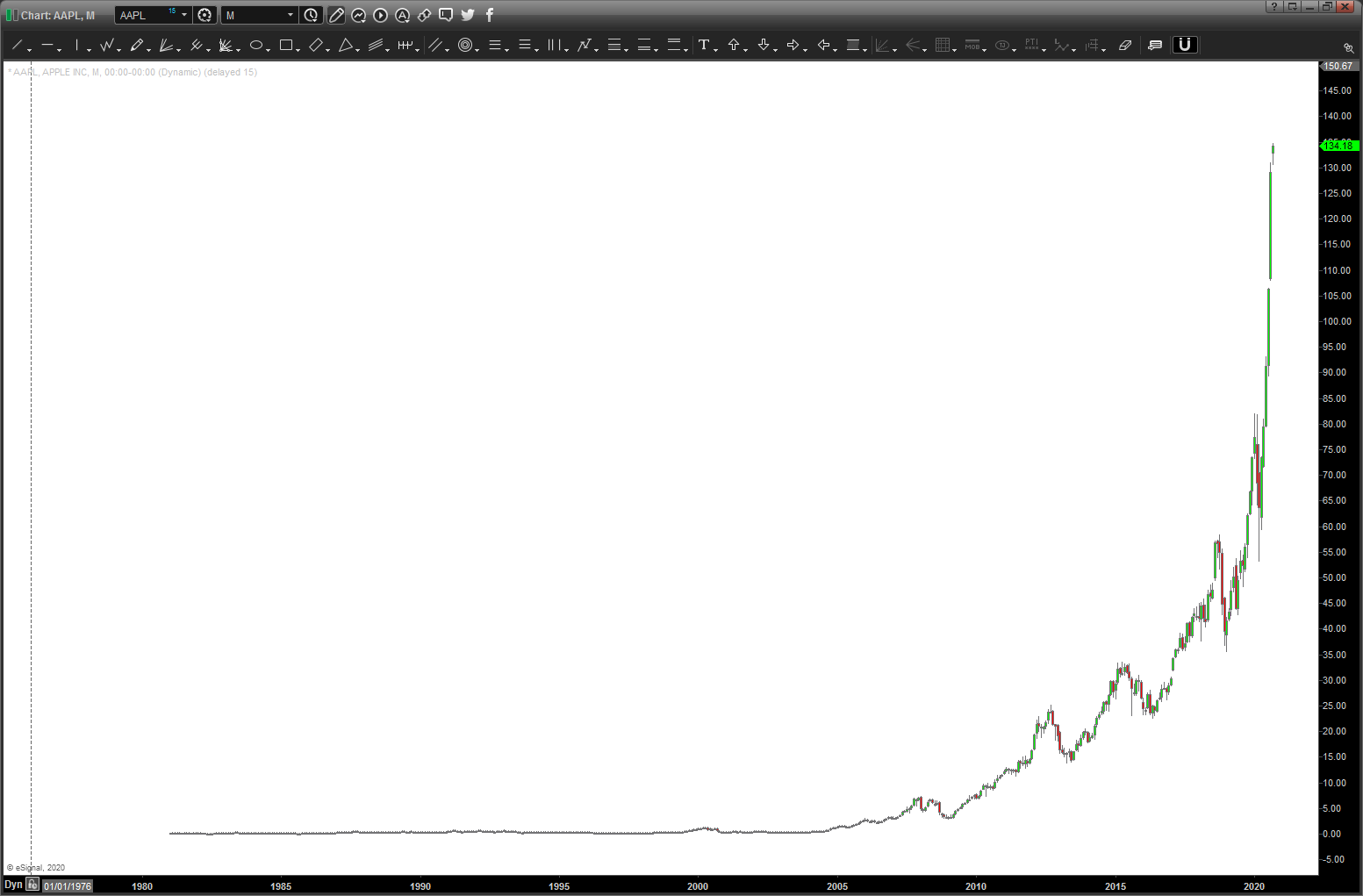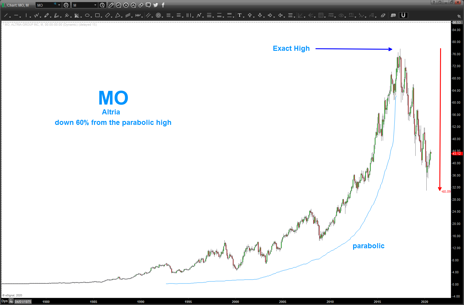 The coolest thing about topping out was the jet was STILL in full afterburner …but guess what, it just wouldn’t go any higher and then it flipped over on its back, flopped around out of control and fell like a stone. Nothing to worry about when your 10 miles above the earth but still a little erie to be honest. What happened? Well Ps went to zero. Yup .. the power to keep the jet climbing was gone. Night night, we were done …. the SAME THING HAPPENS IN THE STOCK MARKET WITH PARABOLIC MOVES.