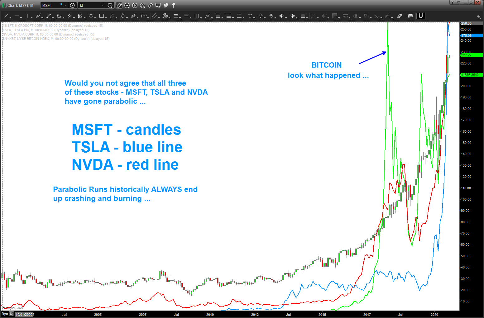 The fact is parabolic moves never (strong statement) or shall I say ‘most of the time’ don’t end well. I’m going to show the parabolic moves that are literally rocket ships and then walk thru some of the charts from the past that show parabolic moves and their outcomes … what’s interesting is they all really do look the same …and, if you can ride out the opposite side of the tsunami it can and will come back . but do you want to eat it if your on the wrong side of the market? I can’t answer you as that is part of your PERSONAL RISK MINDSET.