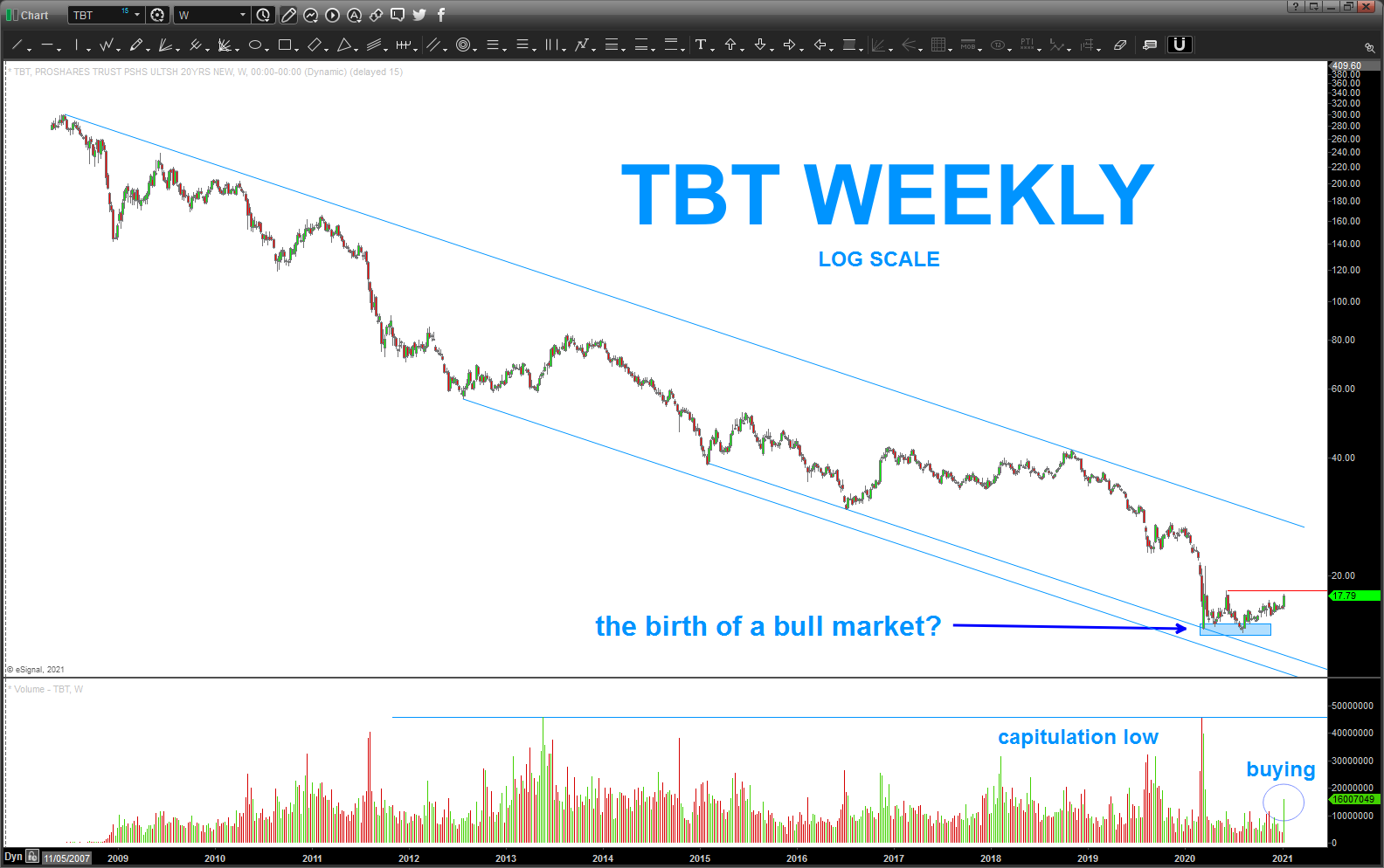 if you followed some of the other Bond work on the site then you would know our thesis is there is a MAJOR HIGH in bonds (TBT is the inverse) so, we could be, perhaps, looking at the very beginning of a BIG run in TBT.
