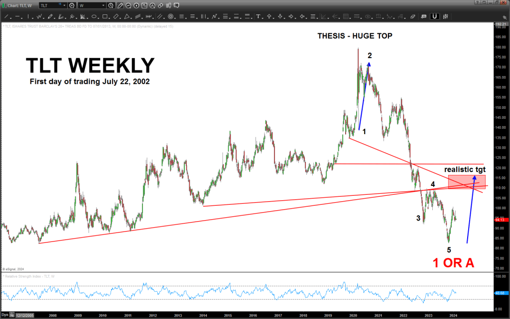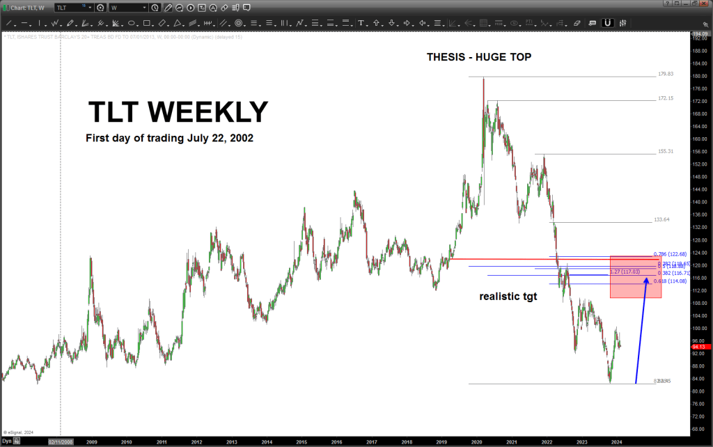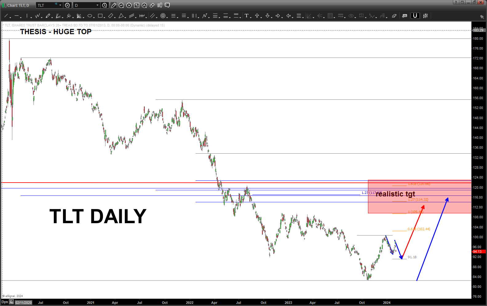 But, given that I am “correct” I have put realistic target up there because, in this current environment, the TLT could go all the way up to 180 and STILL be against the “trend” which – I believe started w/ the high back a couple years ago.