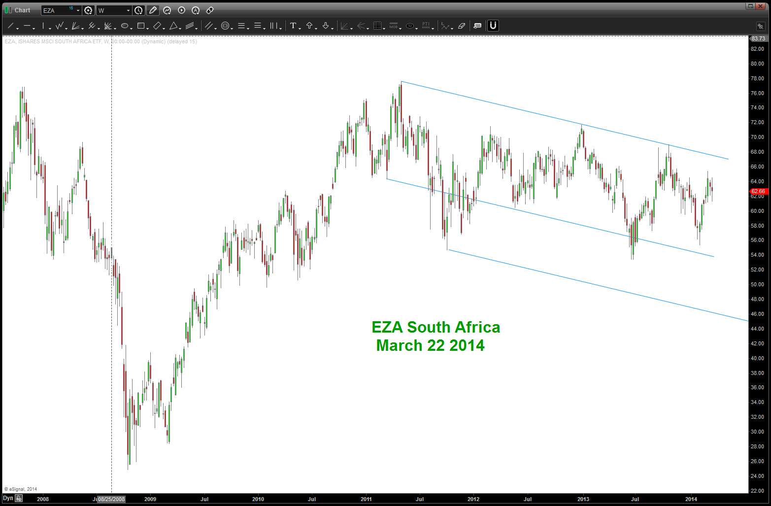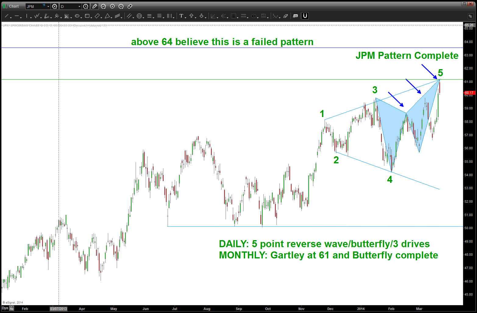 Folks, only probability but this pattern is complete. If we get a daily open/close above 64 I would assume this pattern had failed.