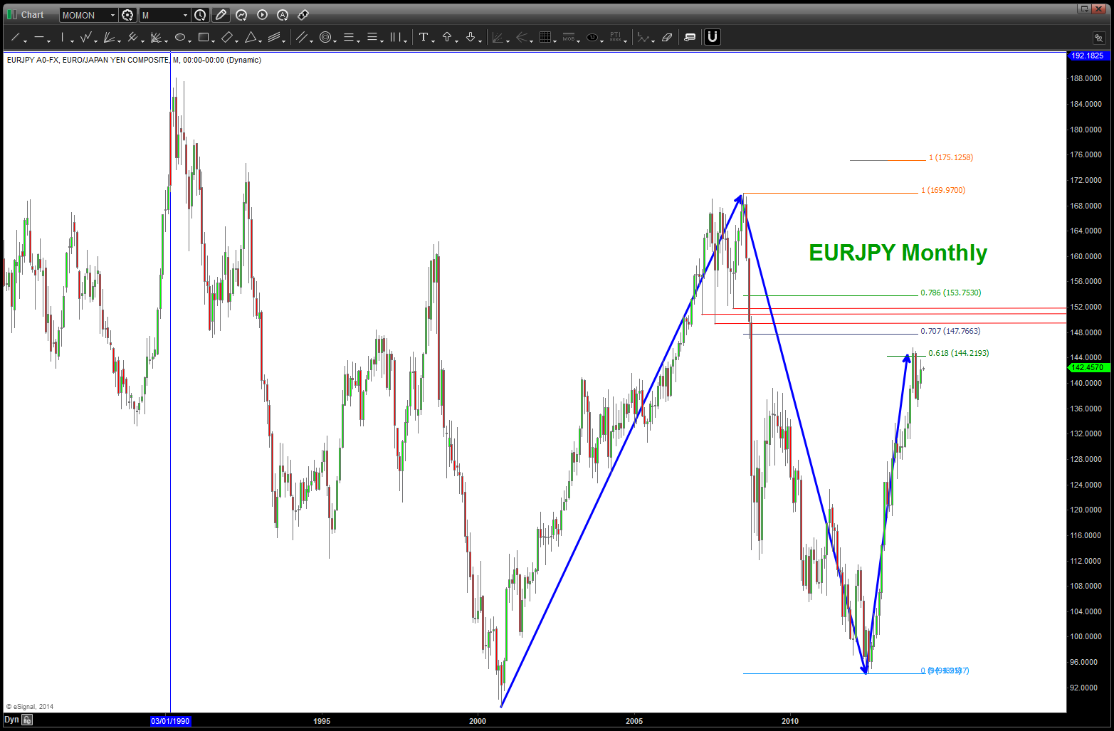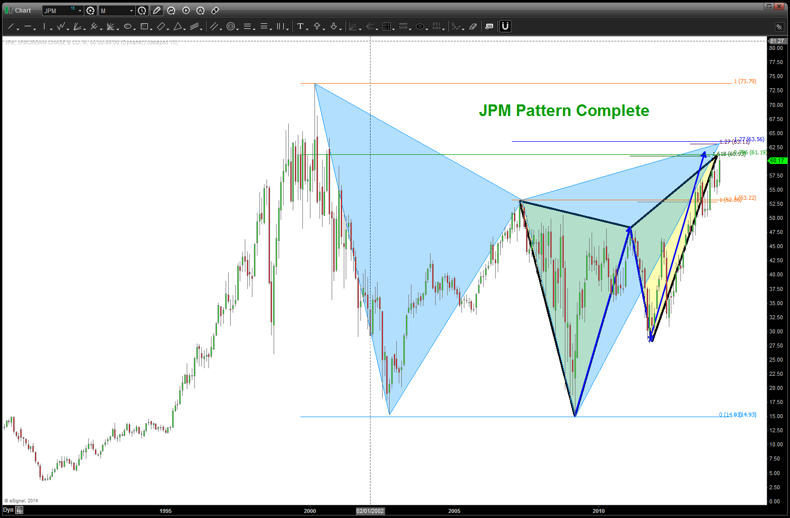 - now, currently, the 1896-2007 leg is projection to an area EXACTLY to where we close today …additionally a 1.618 extension from the 2007 top is at the exact same area.