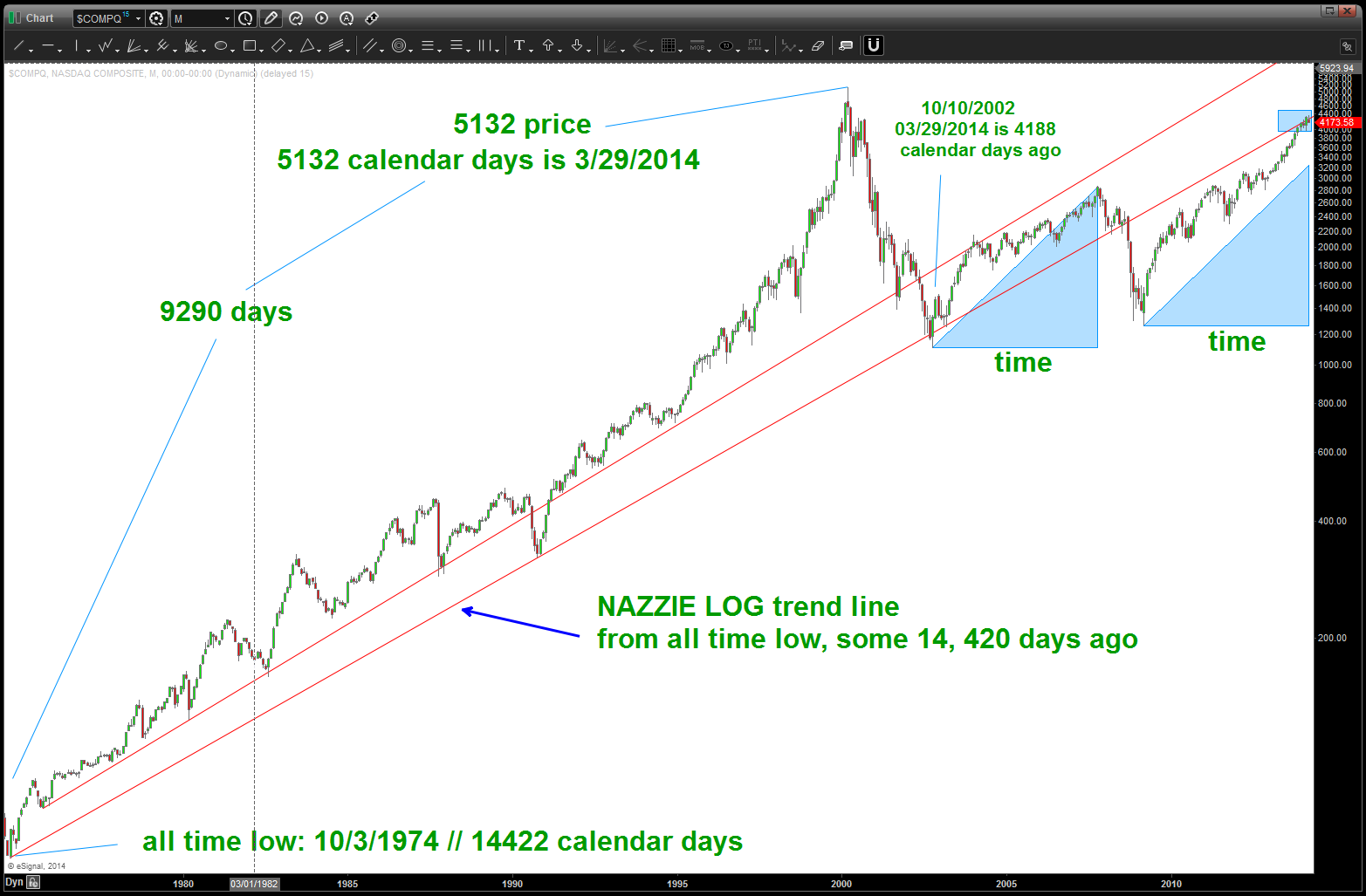 folks, it’s all about the swing low … while the NASDAQ is continuing to break down like our targets expected, it has not broken a major swing low, yet. This weekend will be very key as we “square out” in days the all time high of 5132. Additionally, note we are only 15 points from 4188 which is the calendar day count from the 10/10/2002 low. So … we have 1) targets being hit in PRICE and 2) equal TIME rally up (noted by blue triangles) and 3) butting against major trend line resistance and 4) a potential square out of price and time from major highs and lows.