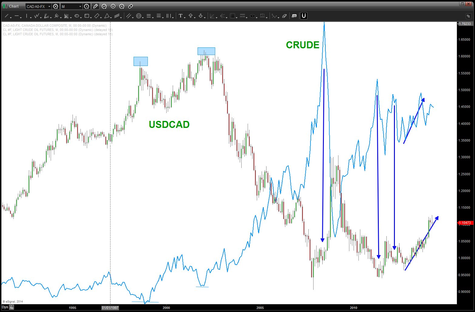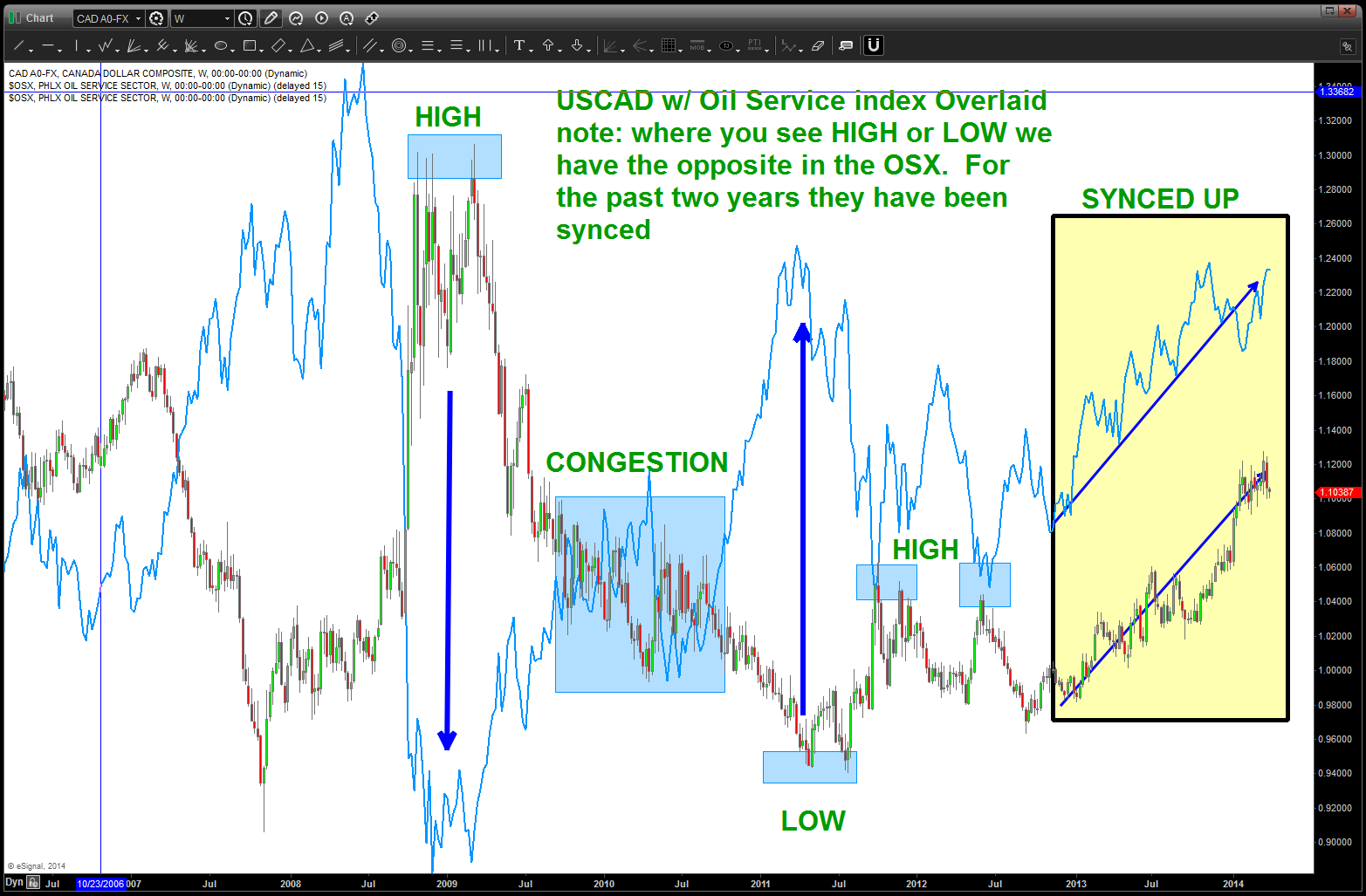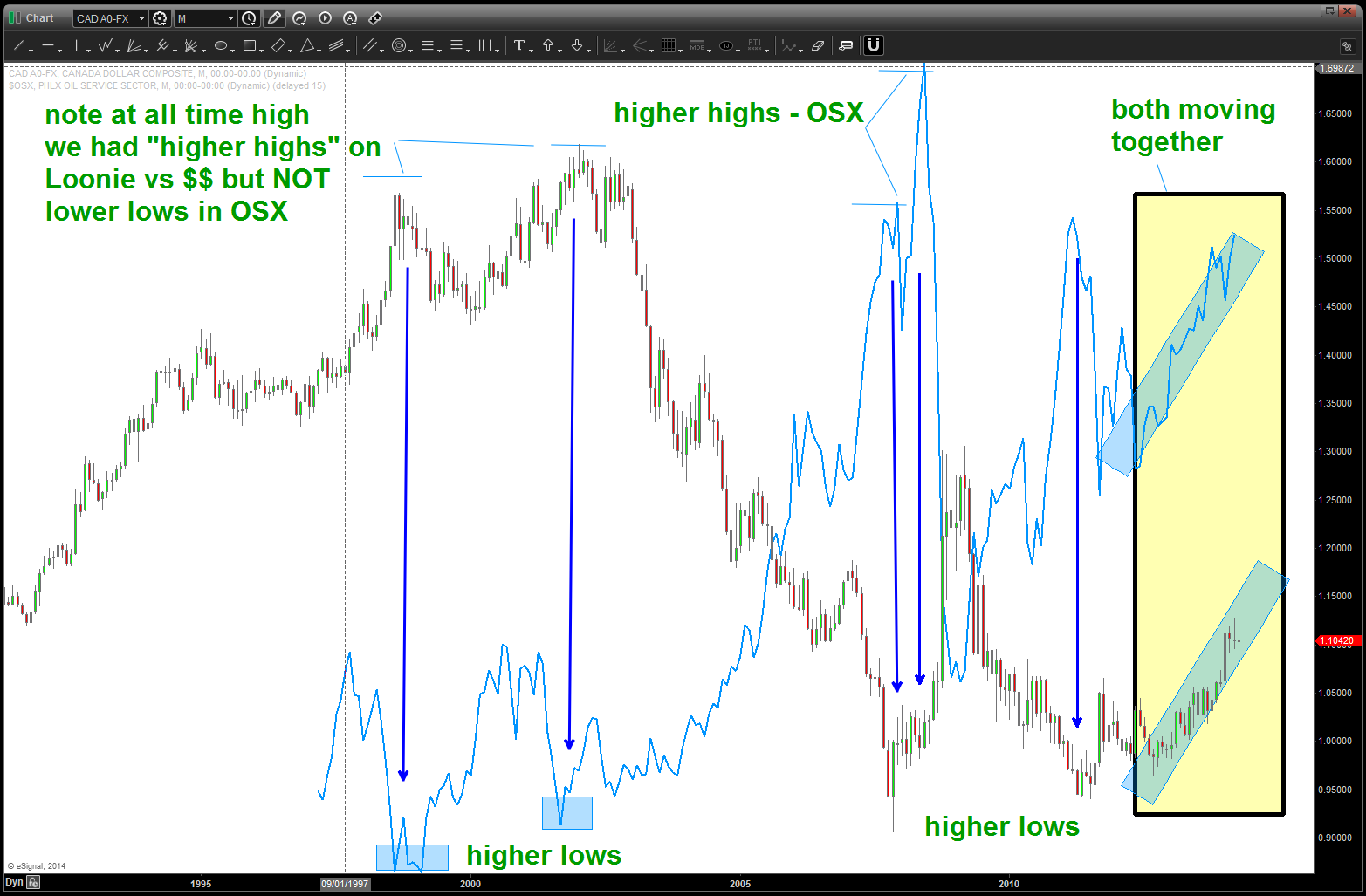 so, at times, one could look to the Oil Service Sector and see if a BUY or SELL pattern completed and then look for the opposite pattern to appear on the Loonie vs the USD. For two years that has not been the case .. they are moving together. They could roll together into infinity but something certainly doesn’t make sense …