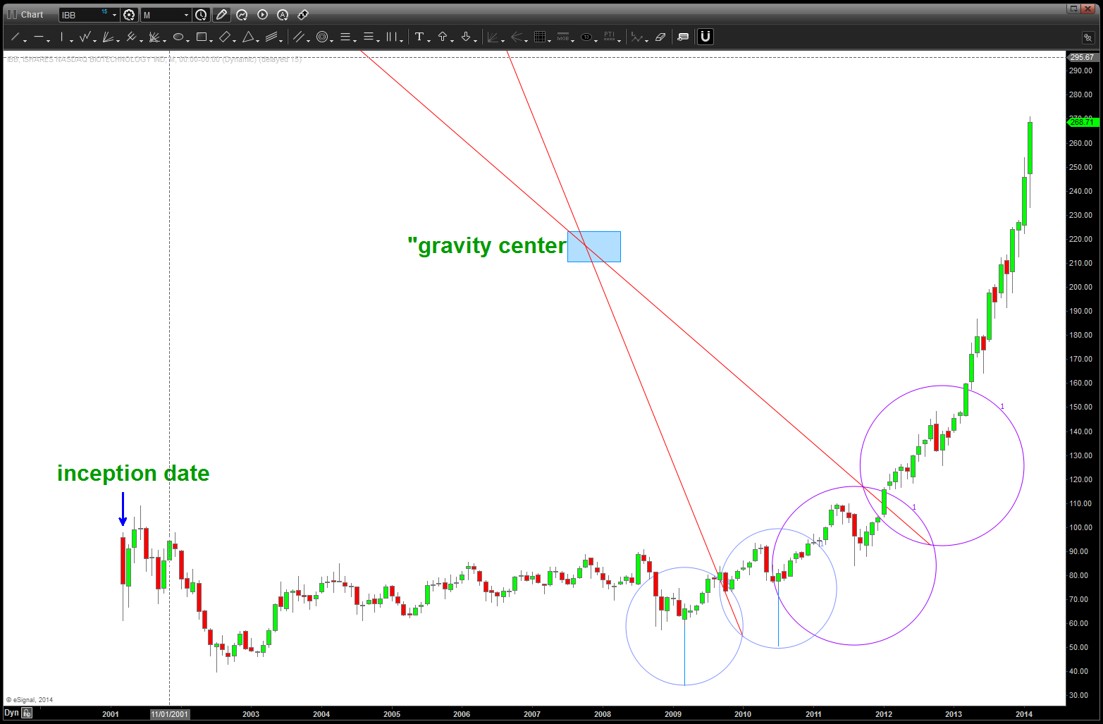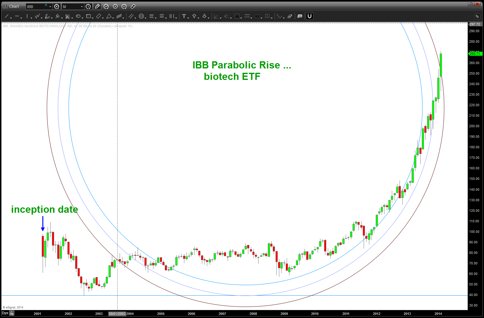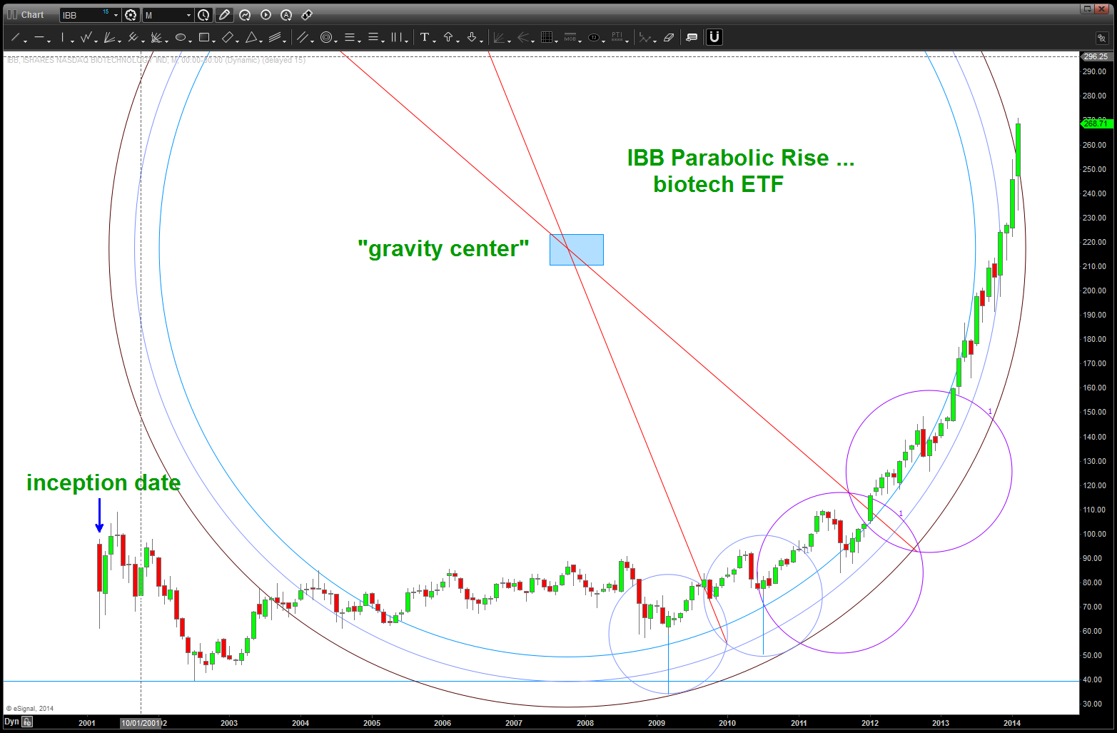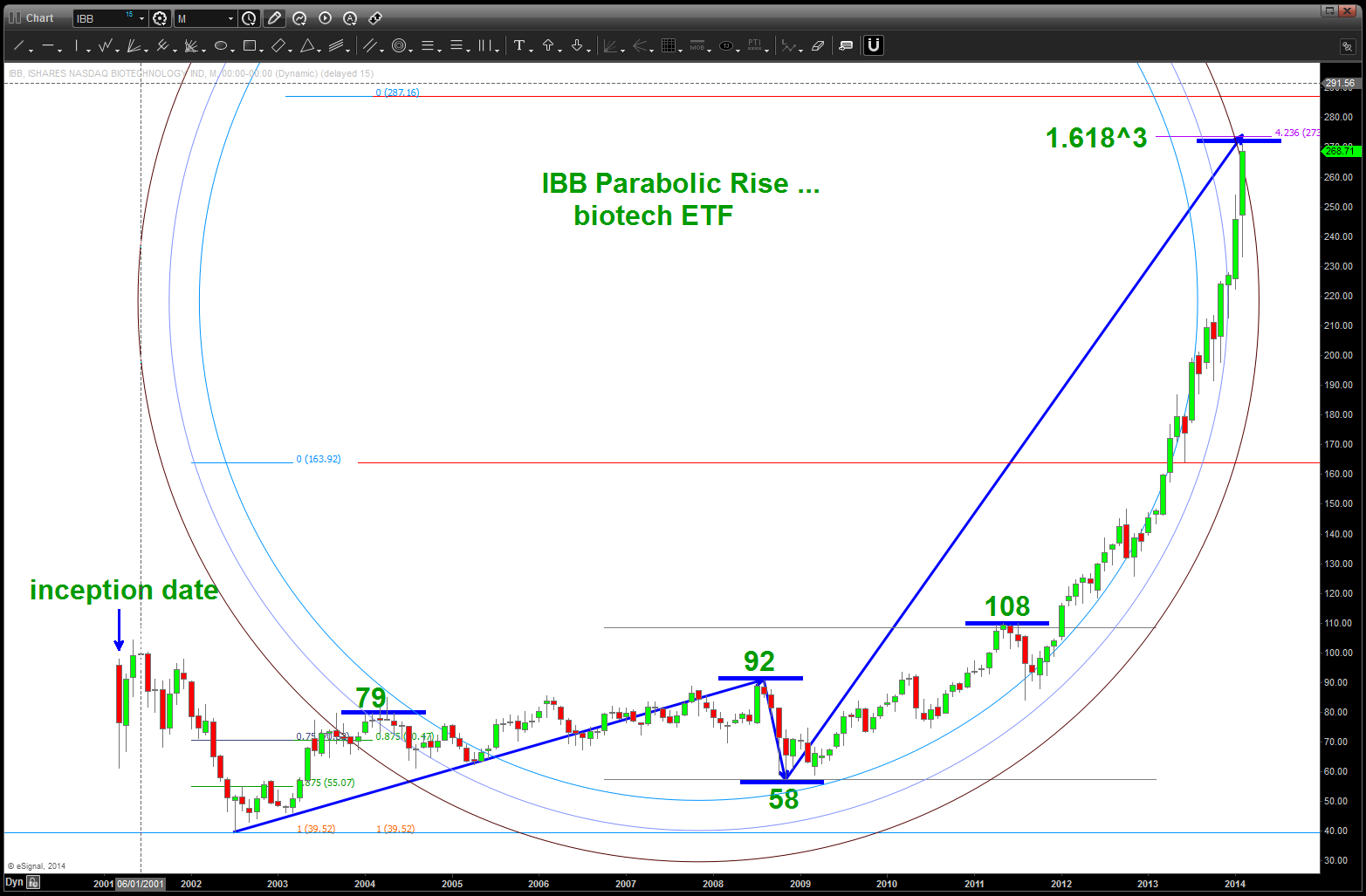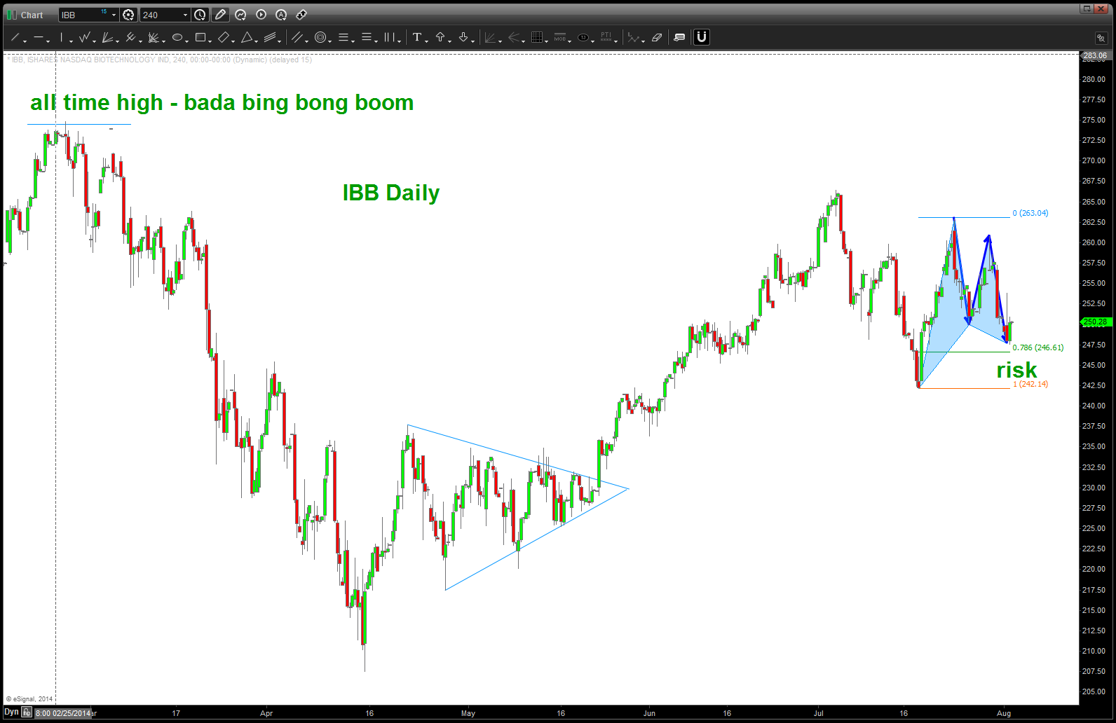 I was asked to take a look at IBB again and decided to re-post the below. Look folks, as much as the below is a work of art I’ve also been wrong on the patterns. it’s all probability and the patterns are always CORRECT? Why, because they LET YOU KNOW WHERE YOU ARE WRONG! And, when you become an advanced pattern recognition trader, IF (the big if) you execute correctly THEN you know that you’ve done everything you can do to manage risk and your not SURPRISED or HAPPY when one works or SURPRISE and SAD when one doesn’t. The PATTERN will work or it wont …off my soap box.